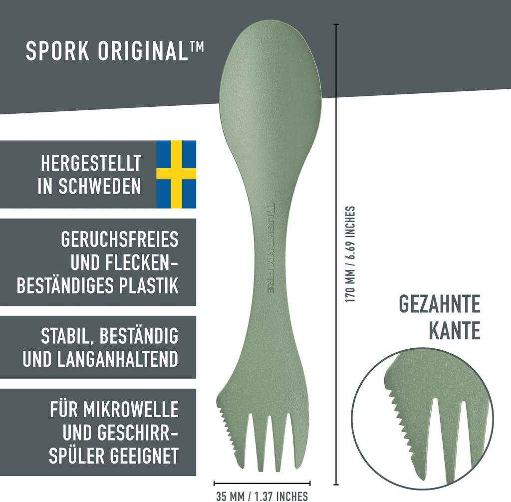 A Light My Fire Spork Original egy forradalmi 3 az 1-ben evőeszköz, amely tökéletesen ötvözi a kés, villa és kanál funkcióit. Ez a svéd márka által kifejlesztett termék ideális választás azok számára, akik aktív életmódot folytatnak, legyen szó kempingezésről, túrázásról vagy egyszerűen csak a munkahelyre való étkezésről. Az eredeti Spork nem csupán praktikus, hanem stílusos is – a természettel való kapcsolatunkat szimbolizálja, miközben a modern dizájn és a fenntartható anyagok kombinációja teszi igazán különlegessé.