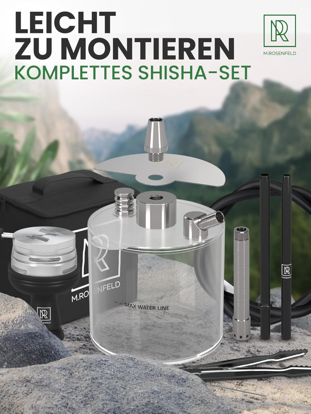 M. ROSENFELD Mini Vízipipa Utazáshoz Táskával és Prémium Kiegészítőkkel - Hordozható Shisha Szett Acrylic Tállal és Rozsdamentes Diffúzorral