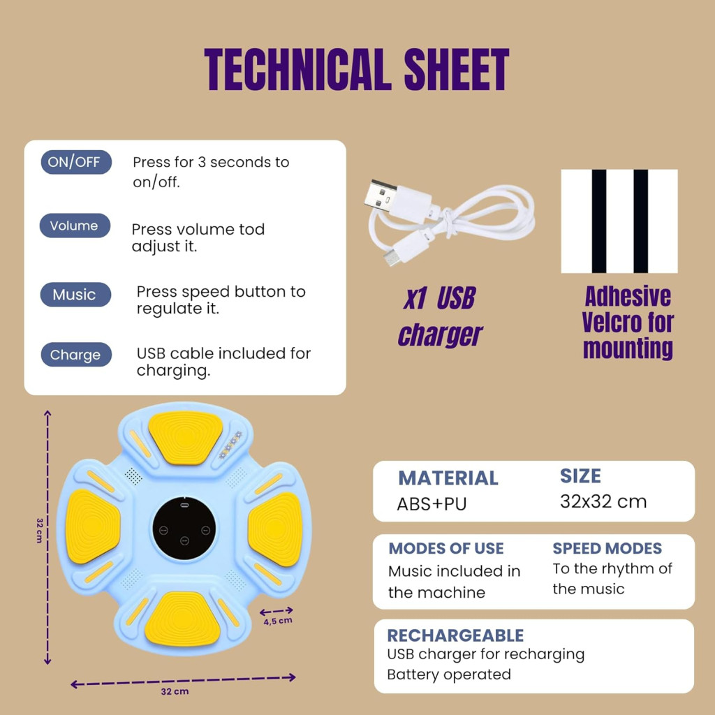 A MAGIC SELECT Musical Boxing Machine egy innovatív falra szerelhető edzőgép, amely ötvözi a modern technológiát a sportolás szórakoztatásával. Ez az eszköz nem csupán egy hagyományos boxozógép, hanem egy interaktív edzési rendszer, amely három beépített dal ritmusára világít, és ezáltal az edzést dinamikus, szórakoztató élménnyé alakítja. A 32 x 32 cm-es kompakt méret ideális otthoni használatra, míg a LED világítás és a zenei szinkronizáció a gyerekek és felnőttek koordinációját, reflexeit és ütési ritmusát fejleszti.