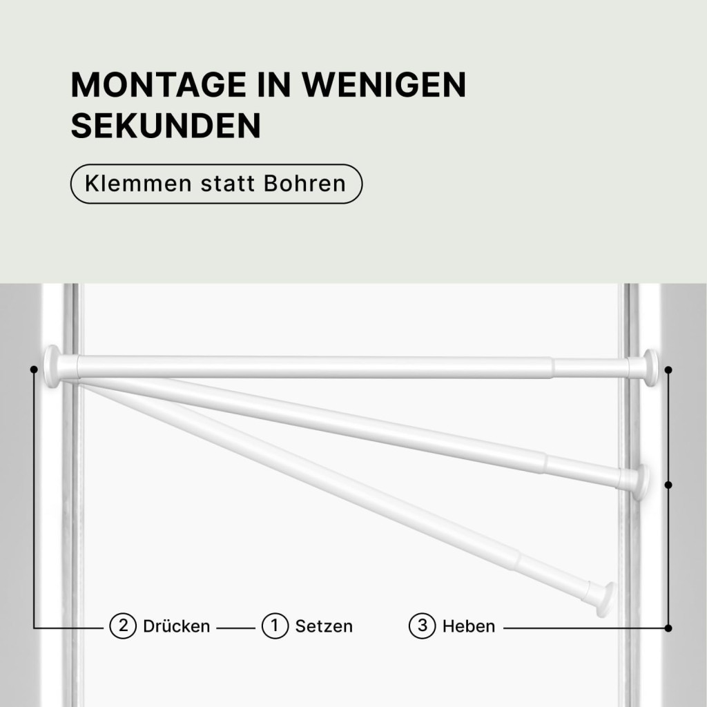 A fúrás nélküli telepítés ideális bérlőknek és azoknak, akik nem szeretnék a falat károsítani. Mindössze 2 perc alatt felszerelhető, és nem szükséges semmiféle szerszám. Az elegáns fehér szín és a prémium felület hosszú ideig megőrzi szépségét, így a rúd évekig megbízható kiegészítője marad az otthonnak.