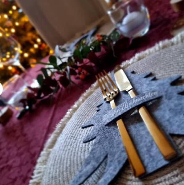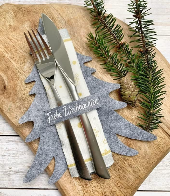 Az MKISHINE karácsonyi evőeszköztartó táska egy igazi ünnepi csemege, amely minden karácsonyi asztal fénypontjává válik. Ez a kézzel készített filc táska elegáns "Frohe Weihnachten" felirattal díszített, amely német vidéki stílust tükröz. Az evőeszközöket, szalvétákat vagy menüket könnyedén elhelyezheti benne, így garantáltan lenyűgözi vendégeit az adventi vacsora során és karácsony estéjén is.