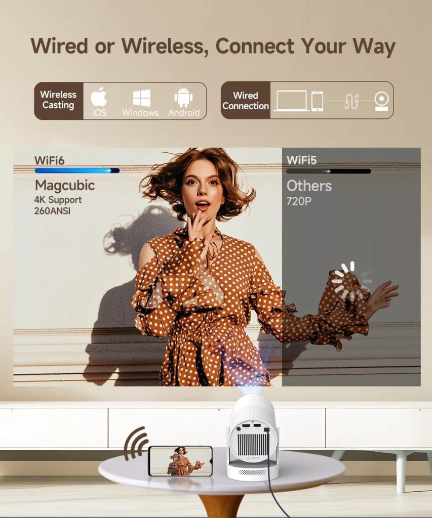 A Magcubic Mini Projektor egy kiváló választás azoknak, akik egy megbízható, könnyen használható és sokoldalú vetítési megoldást keresnek. Az Android 14 operációs rendszer és a WiFi 6 technológia biztosítja, hogy mindig a legújabb alkalmazásokat és a leggyorsabb internetkapcsolatot kapja. Az elektromos fókuszálás és az automatikus trapézkorrekció garantálja, hogy a kép mindig tökéletes lesz, függetlenül attól, hogy hol helyezi el a projektort.