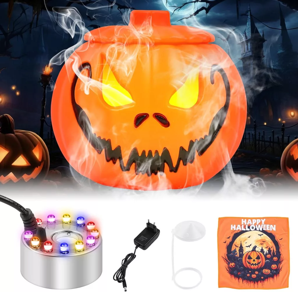 MaxEarn 12 LED-es Ködgenerátor - Háromszínű Halloween Tök Párásító, Ultrahangos Ködképző Fröccsenésgátlóval, Kerti Tó Szökőkút Dekoráció