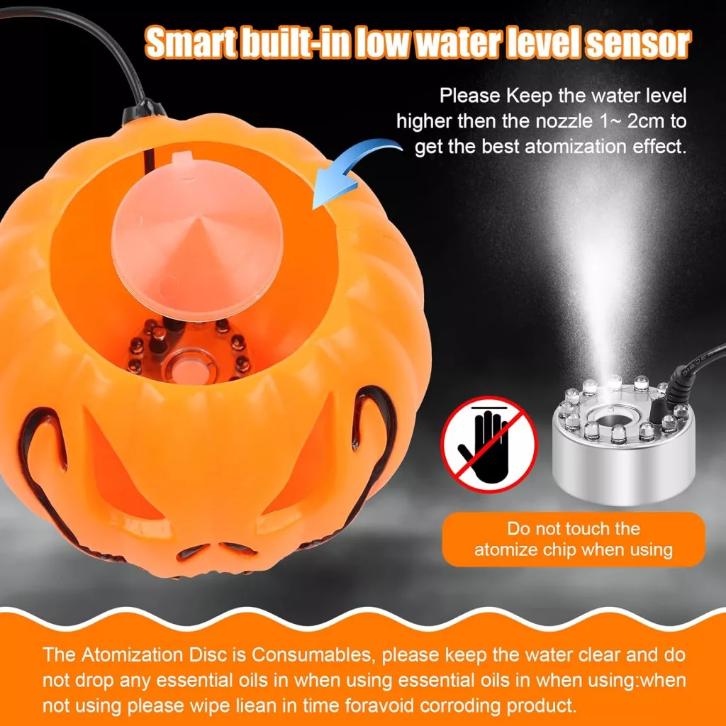 A ködfejlesztő használata rendkívül egyszerű: csatlakoztassa a páragenerátort és az adaptert, helyezze a készüléket a vízzel töltött tök burkolatba, kapcsolja be, és máris élvezheti a varázslatos ködhatást. Az optimális vízszint a szenzor tetejétől számított 1-2 cm.