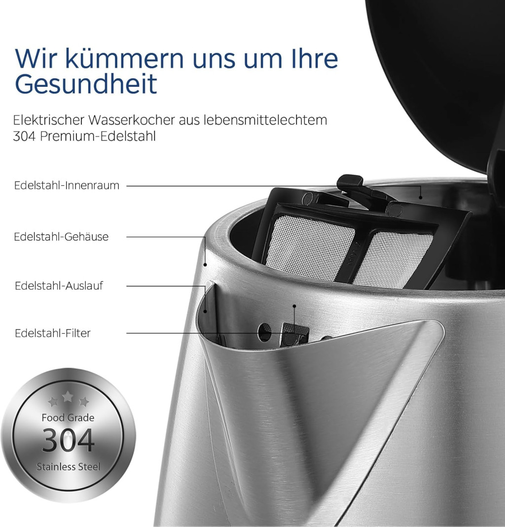 A 2200 W teljesítménnyel felszerelt vízforraló mindössze néhány perc alatt forralja fel a vizet, így ideális a családok és nagyobb csoportok számára. Az intelligens biztonsági funkciók és a felhasználóbarát kialakítás ezt a terméket az elektromos vízforralók között kiemelkedő választássá teszik.