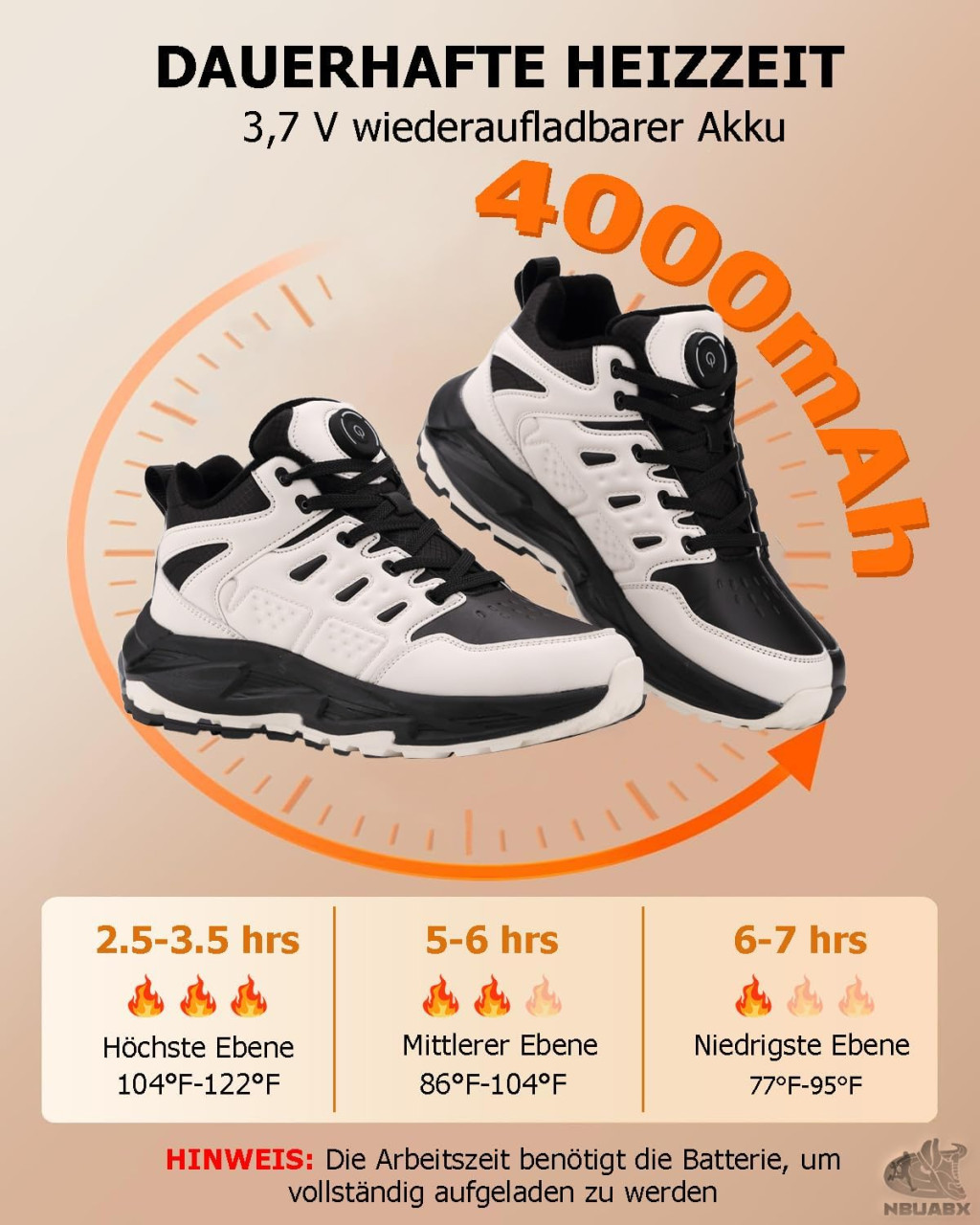A NBUABX fűthető cipő tökéletes választás mindazok számára, akik szeretik a kültéri tevékenységeket, de nem szeretnék, ha a hideg időjárás korlátozná őket. A beépített fűtőelemek gyorsan felmelegítik a lábat, javítják a vérkeringést, és kellemes meleget biztosítanak akár a leghidegebb napokon is. A vízálló külső réteg és a csúszásgátló talp további védelmet nyújt a téli időjárás viszontagságai ellen.