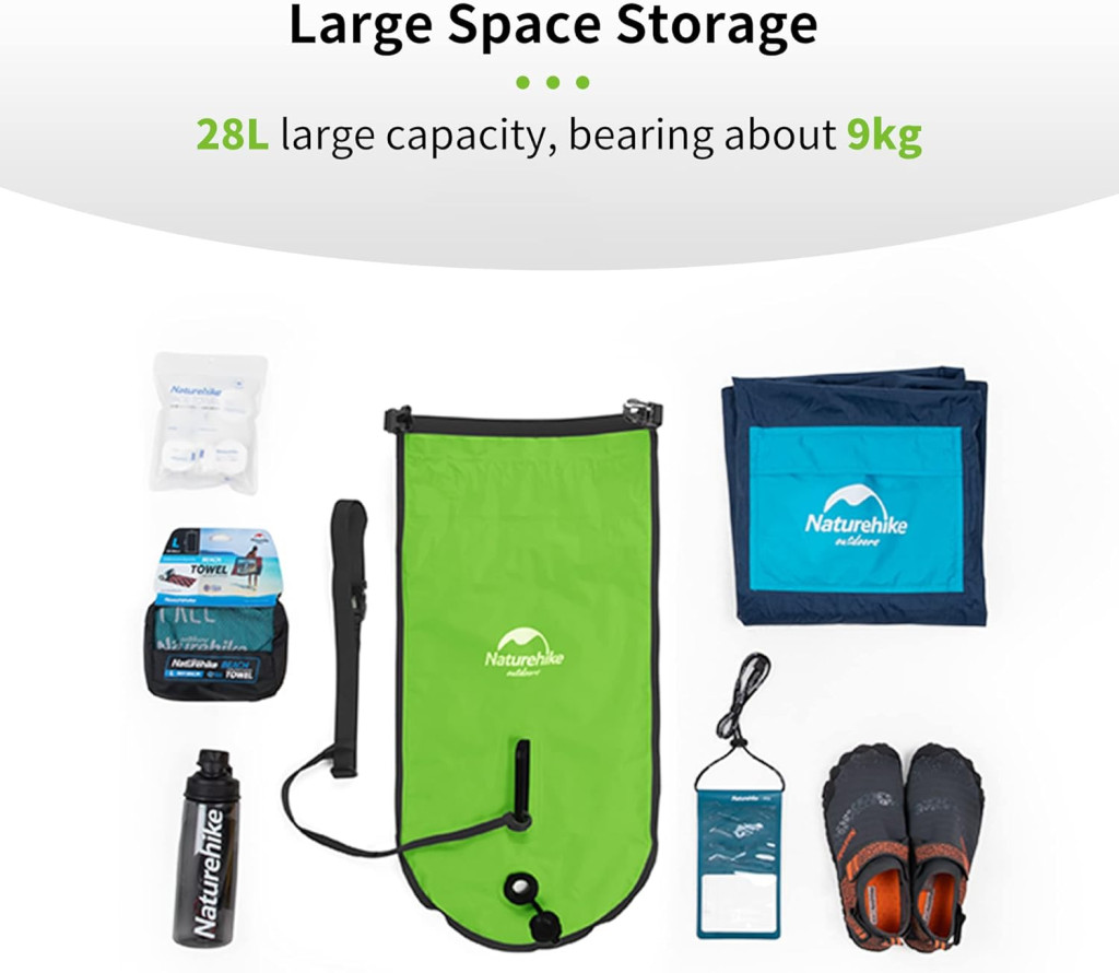 A Naturehike vízálló táska egy innovatív megoldás azok számára, akik szeretik az aktív vízisportokat és kültéri kalandokat. Ez a 28 literes kapacitású táska nem csupán egy szokványos vízálló tárolóeszköz, hanem egy multifunkcionális kiegészítő, amely úszógyűrűként is funkcionál. Az állítható övvel könnyedén rögzíthető a testhez, biztosítva, hogy értékes tárgyaid biztonságban maradjanak, miközben a vízben vagy száraz terepen mozgolódsz.