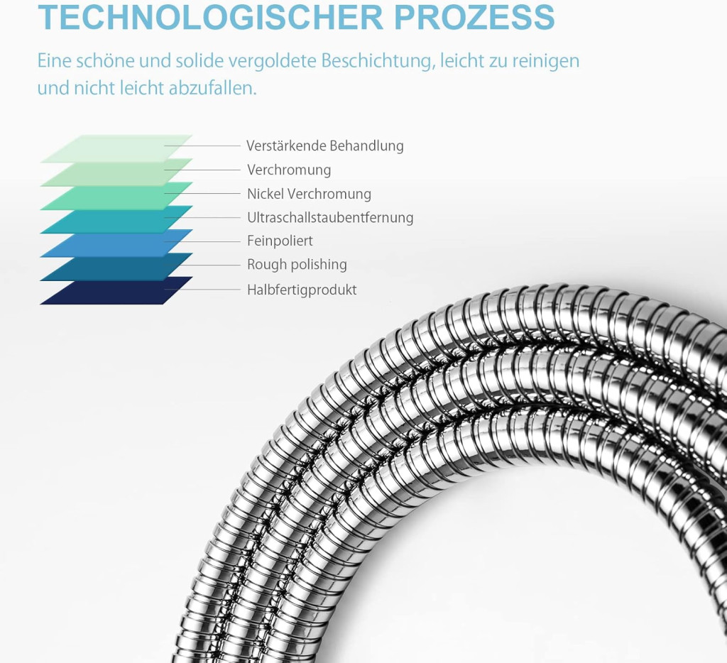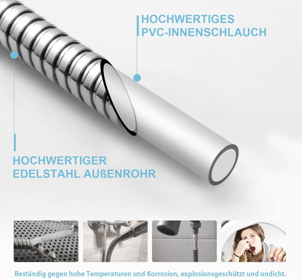 OFFO 1,6 m rozsdamentes acél zuhanycső csavarvédelem és nyomásvédelemmel