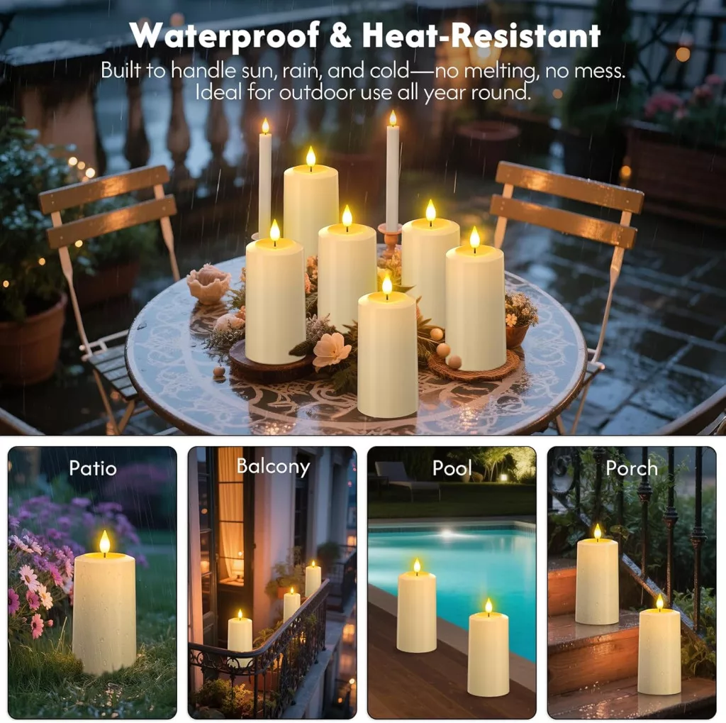 - IP54 vízállóság: A gyertyák ellenállnak a könnyű esőnek és vízcseppeknek, így biztonságosan használhatók kültéren is, függetlenül az időjárási körülményektől.