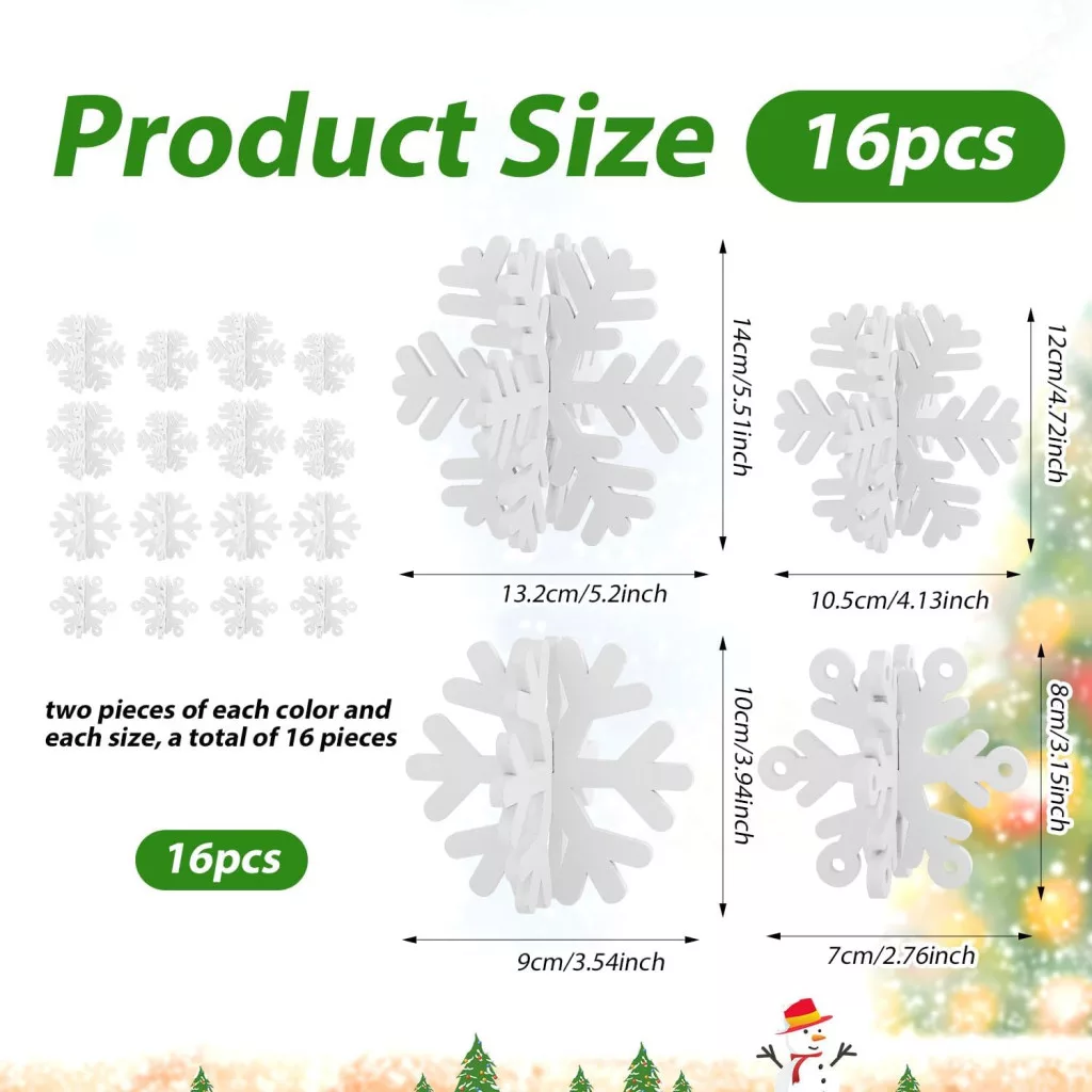 - 16 darabos szett: A csomag 16 darab hópehelyet tartalmaz, amely 8 darab 3D hópehelyre kombinálható