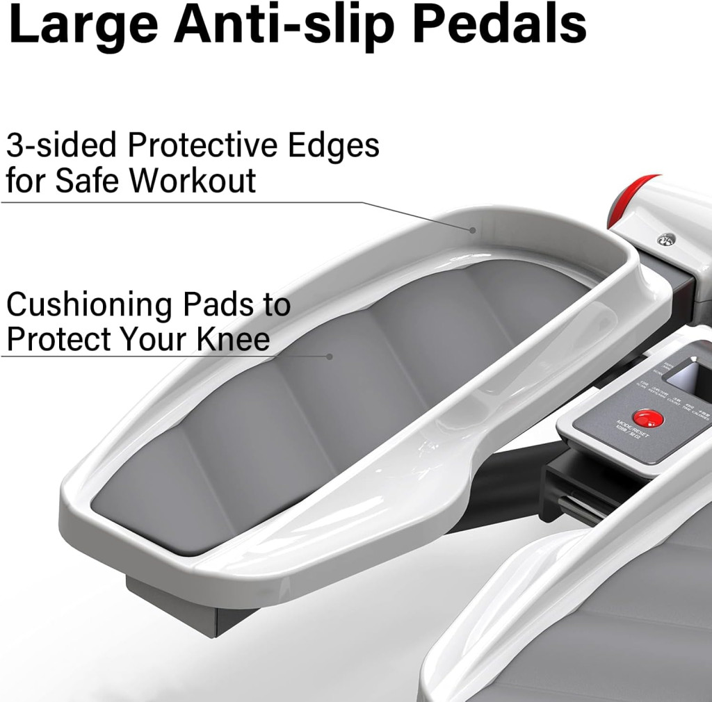 A 33 cm hosszú pedálok háromoldalú sávokkal vannak felszerelve, amelyek megakadályozzák a csúszást és a sérüléseket. A különböző pedálpozíciók beállításával eltérő ellenállást érhet el, így személyre szabott edzést biztosít.
