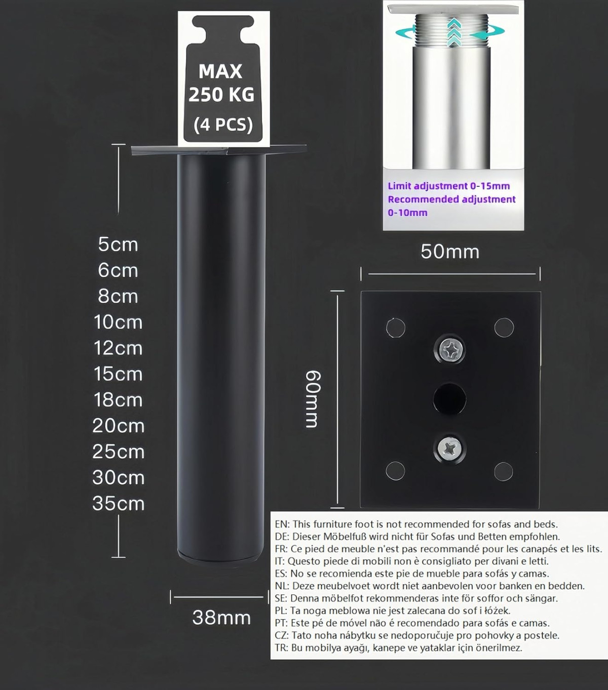 A 38 mm átmérőjű lábak szinte minden bútor típussal kompatibilisek. Az univerzális méret és a csavaros rögzítés lehetővé teszi az egyszerű és gyors telepítést. A csomag 16 rozsdamentes acél csavart tartalmaz, amely elegendő az összes láb biztonságos rögzítéséhez.