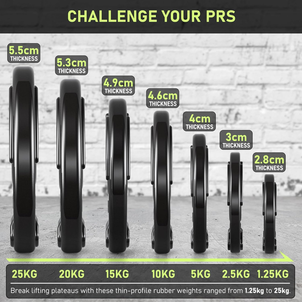 A PhysKcal súlylemezek 50mm-es nyílással rendelkeznek, amely minden szabványos olimpiai rúddal kompatibilis. Az elérhető súlyok 1,25 kg-tól 20 kg-ig terjednek, így könnyedén összeállíthatja az Ön számára ideális edzésrendszert. A vékony profil lehetővé teszi, hogy több lemez kerüljön a rúdra, így maximalizálhatja az edzés intenzitását. A kompakt kialakítás ideális a helytakarékos tároláshoz is, legyen szó otthoni vagy professzionális edzőteremről.