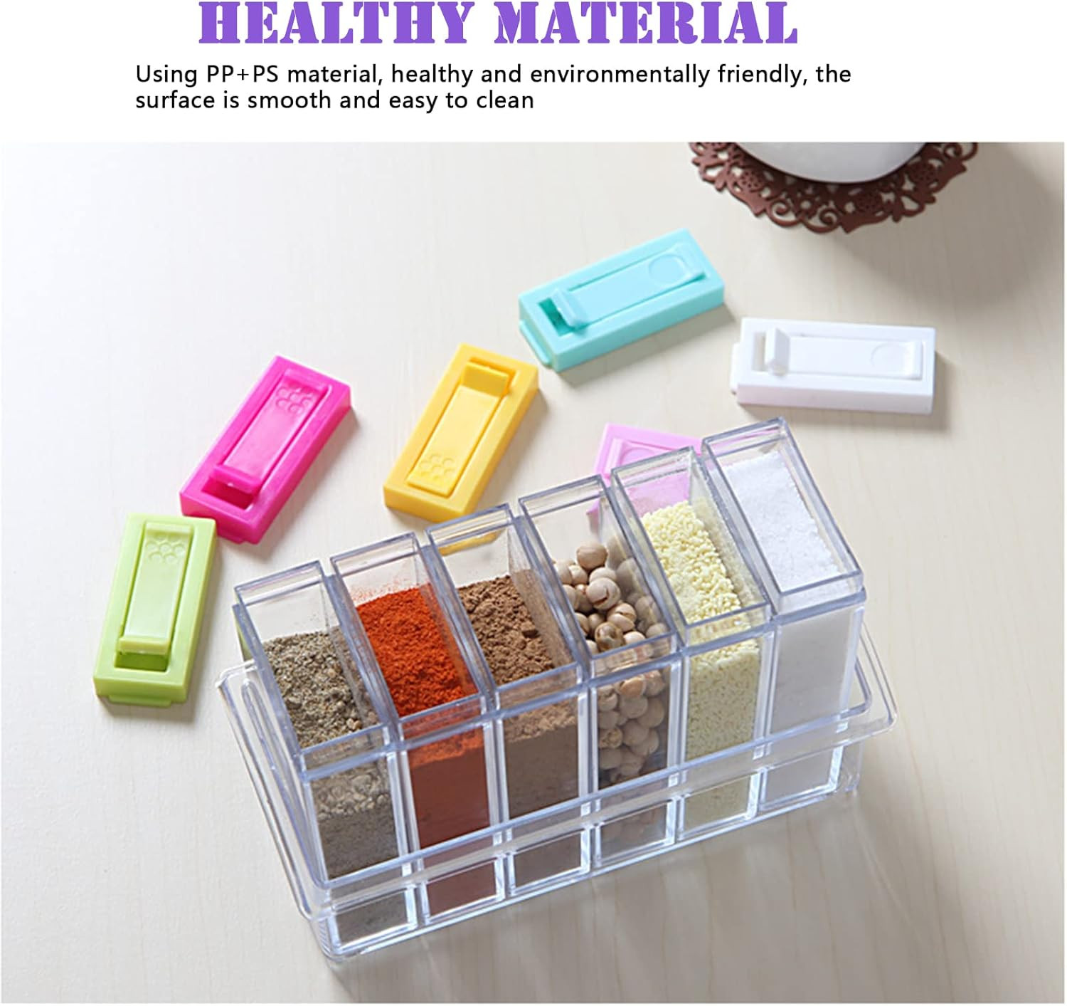 - Kiváló minőségű anyag: Élelmiszerbarát PP és PS műanyagból készült, amely hőálló, szagtalan és nem mérgező, így biztonságosan tárolhatja benne fűszereit.
