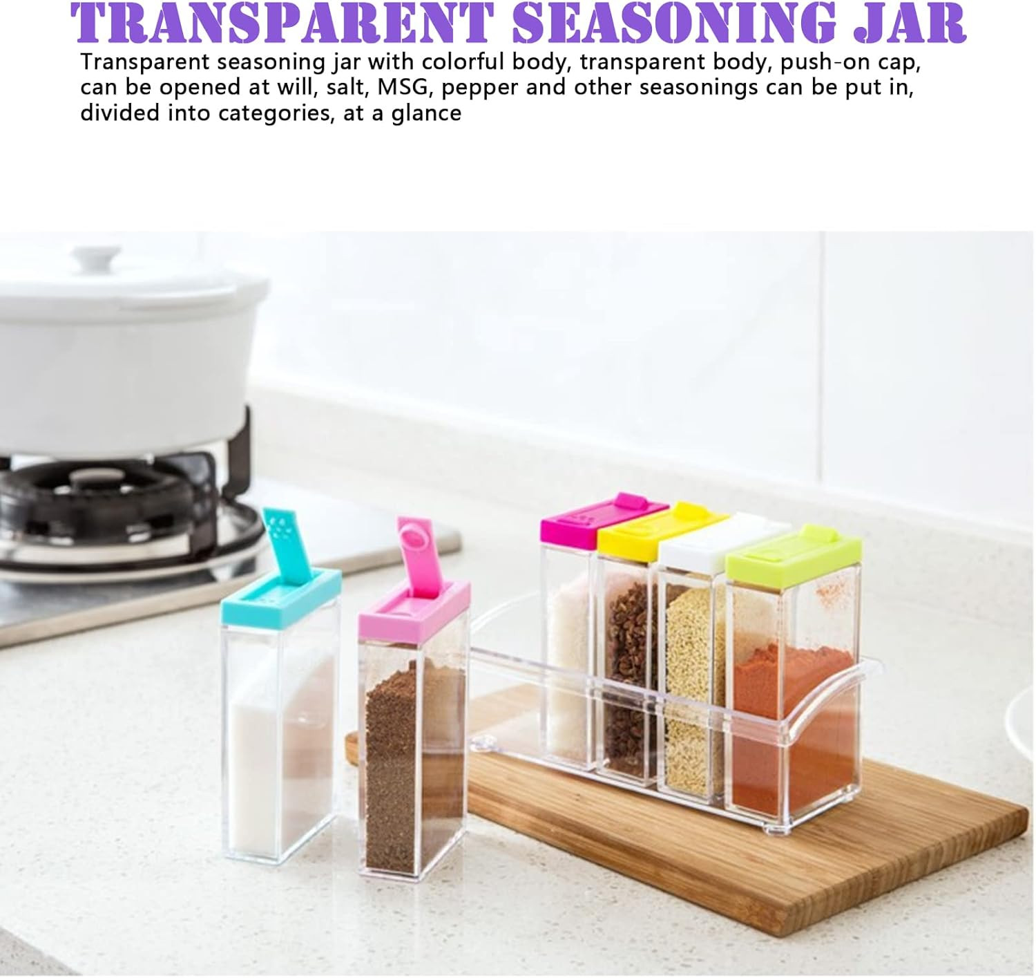 Az élelmiszerbarát PP és PS anyagból készült fűszertartók tökéletesen alkalmasak különféle fűszerek, só, bors, cukor, ízfokozók és egyéb szóróanyagok tárolására. A dobozok átlátszó kialakítása lehetővé teszi, hogy azonnal lássa, mi van bennük és mikor kell újratölteni őket. A színes tetők pedig segítenek a gyors azonosításban és a konyhája stílusához való illeszkedésben.