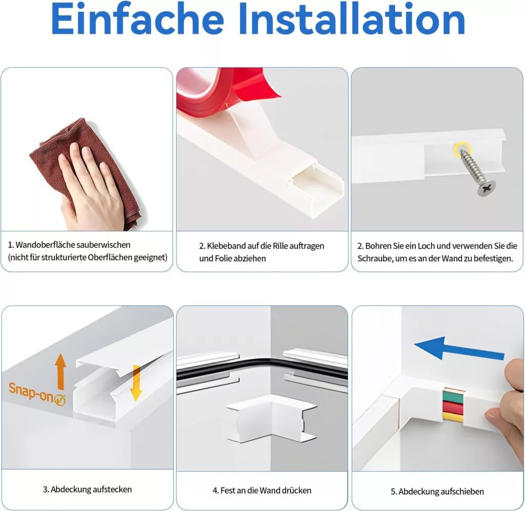 • ️ A biztonságosabb telepítés érdekében ajánlott a kábelcsatorna felszerelése előtt 24 órával teljesen megtisztítani a falfelületet.
