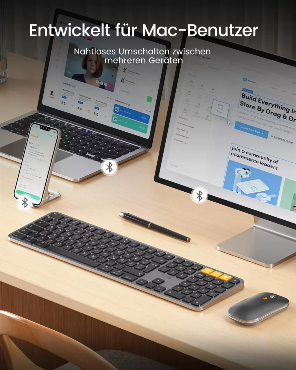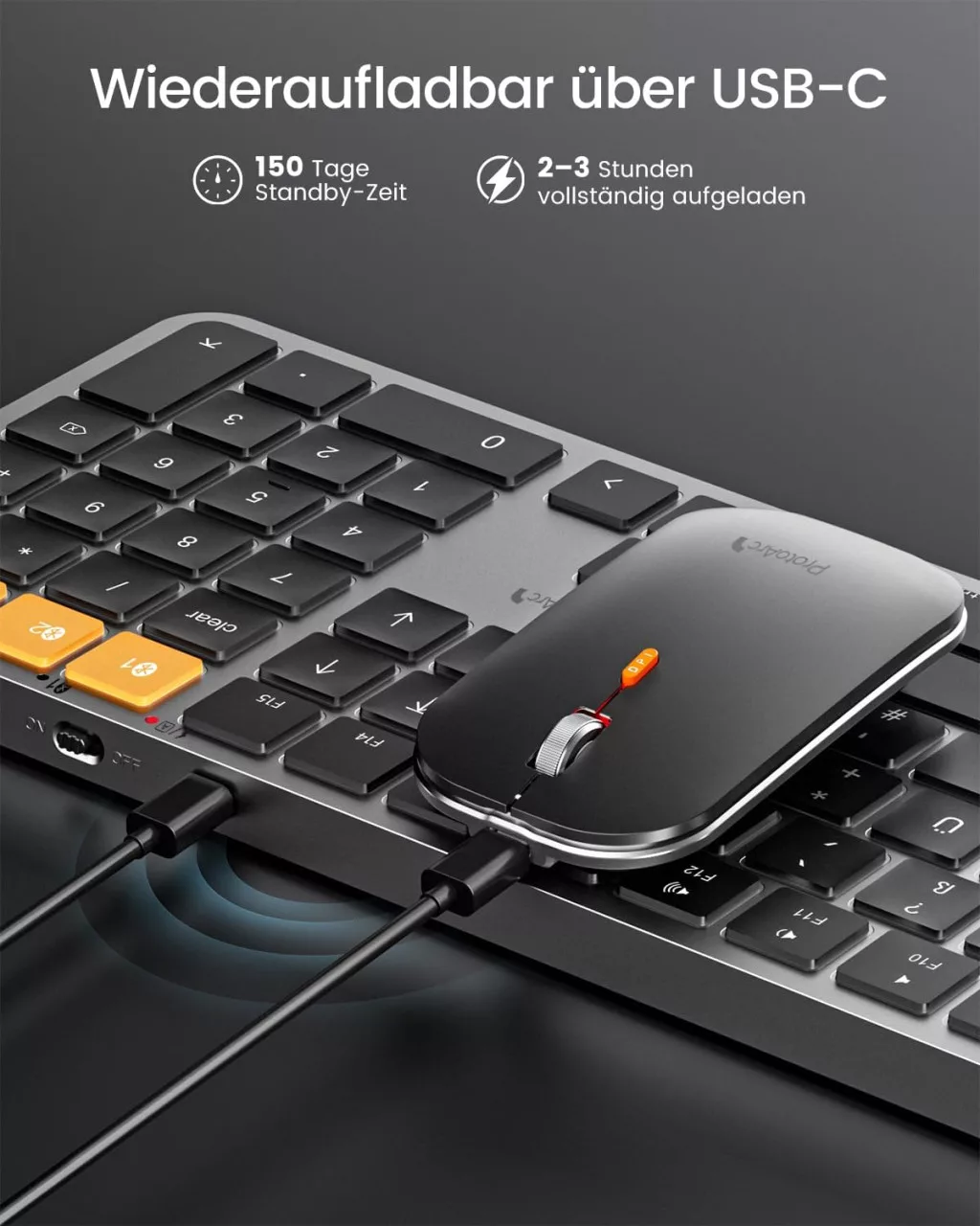 A ProtoArc KM100-A egy prémium minőségű, vezeték nélküli billentyűzet és egér kombináció, amely kifejezetten Mac felhasználók számára lett tervezve. Ez az elegáns szett teljes méretű QWERTZ német billentyűzettel rendelkezik, és három különböző eszközzel képes egyidejűleg csatlakozni Bluetooth technológia segítségével. Az ultramodern design és a kiváló funkcionalitás tökéletes kombinációja teszi ezt az ideális választássá MacBook Pro, MacBook Air, Mac Mini, iMac, iPad és iPhone felhasználók számára.