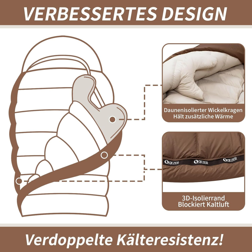 Sac de dormit ultraușor umplut cu puf QEZER 660FP - Model mumie, 3 sezoane, confort -10°C, maro cafea, pentru camping, drumeții, adulți