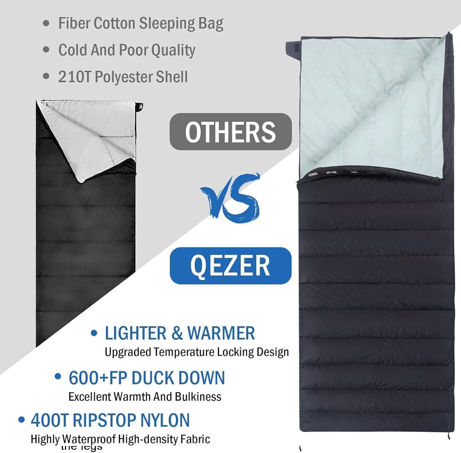 A QEZER daunenschlafsack versenyképes alternatíva más ultraleicht hálózsákokhoz képest. Míg egyes prémium márkák 2000+ forintot kérnek hasonló termékekért, a QEZER kiváló ár-érték arányt kínál. Az 500g kacsapehely kitöltés összehasonlítható a piacon lévő legjobb termékekkel, és az 1060g súly az egyik legkönnyebb kategóriában. A 400T nylon anyag ugyanolyan tartós, mint a drágább alternatívák, de sokkal kedvezőbb áron érhető el.