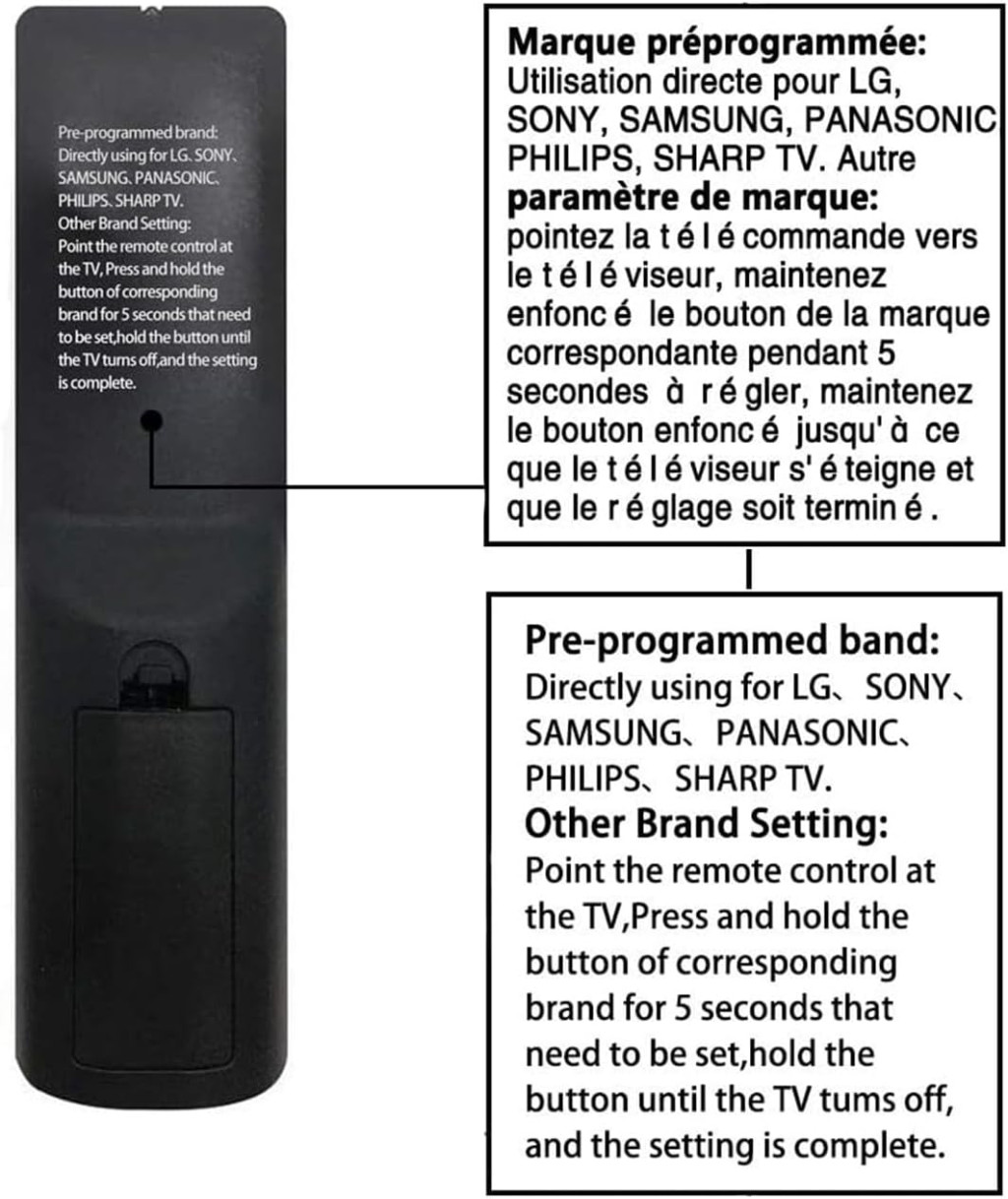 A kompatibilitás ellenőrzése rendkívül egyszerű: ha a TV márkája megtalálható a távirányító paneljén, akkor biztosan működni fog. A beállítási útmutató minden távirányító hátoldalán megtalálható, így nincs szükség külön kézikönyvre.