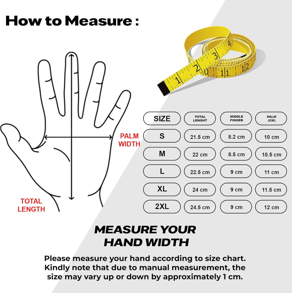 Méretezés: A kesztyűk uniszex kialakítással készültek, és mind férfiak, mind nők számára megfelelőek. Az állítható csukló zárás biztosítja a tökéletes illeszkedést különböző kézméretekhez. A 2XL méret nagyobb kezekhez ideális, de az összes méret elérhető.