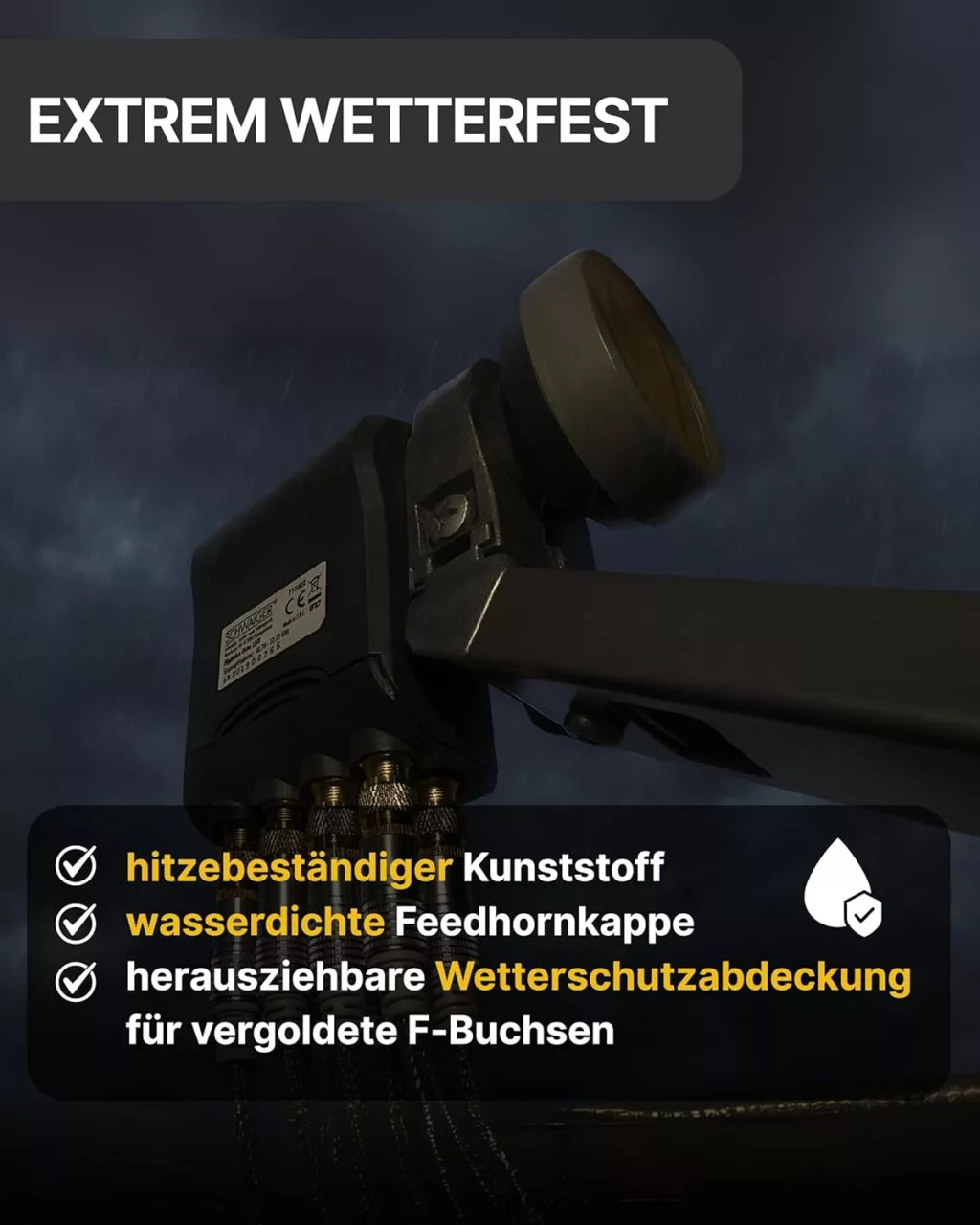 A SCHWAIGER Octo LNB a piacon az egyik legjobb választás az 8 résztvevős rendszerekhez. Más gyártók hasonló termékeivel összehasonlítva, a Schwaiger Sun Protect technológiája és az aranyozott csatlakozók hosszabb élettartamot és jobb jelminőséget biztosítanak. Az időjárás-védelmi borítás és a hőálló műanyag extra védelmet nyújt a szélsőséges körülmények között.