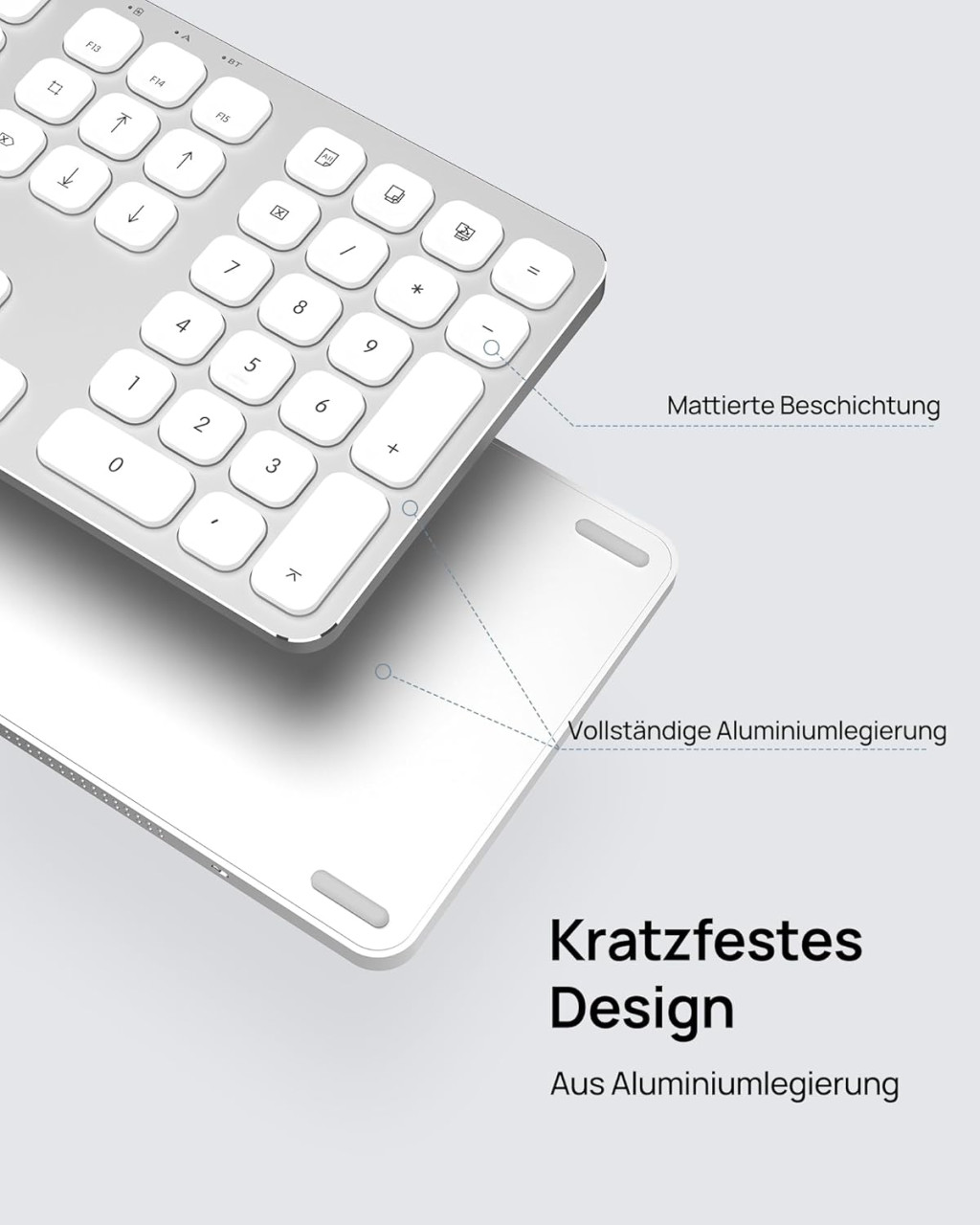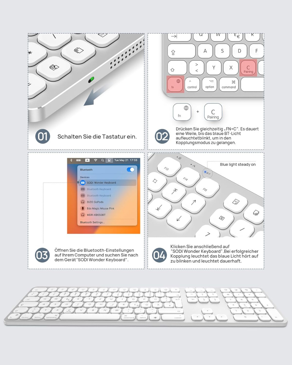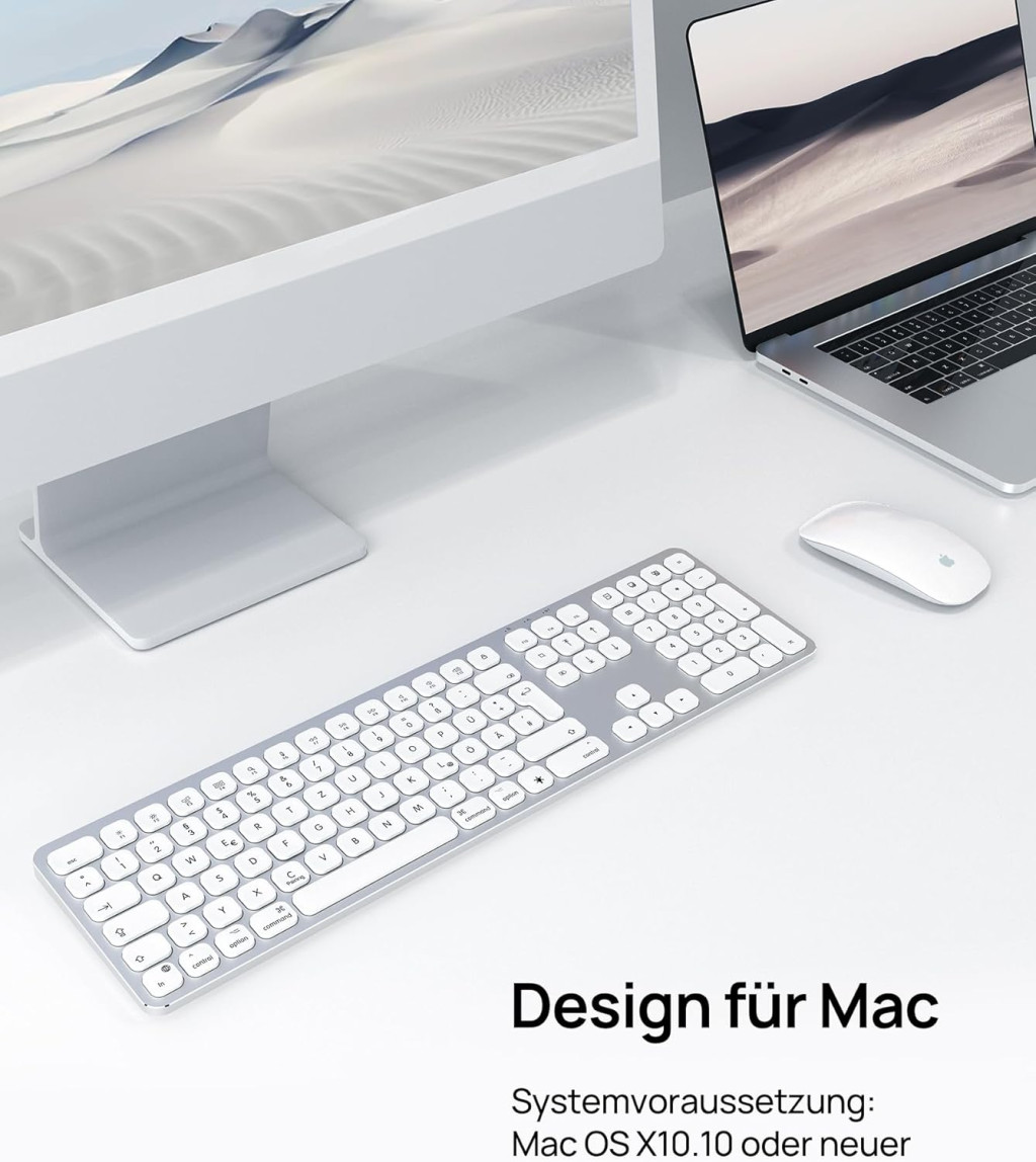 A SODI Wireless Bluetooth Keyboard egy prémium minőségű, vezeték nélküli billentyűzet, amely kifejezetten Mac, iPad és iPhone eszközökhöz lett tervezve. Az elegáns alumínium ház, a 110 gombos teljes méretű kiosztás és a korszerű Bluetooth 5.0 technológia kombinációja egy olyan billentyűzetet eredményez, amely tökéletesen illeszkedik az Apple ökoszisztémájába. A QWERTZ német billentyűzet-elrendezés biztosítja a német nyelvű felhasználók számára az optimális gépelési élményt.