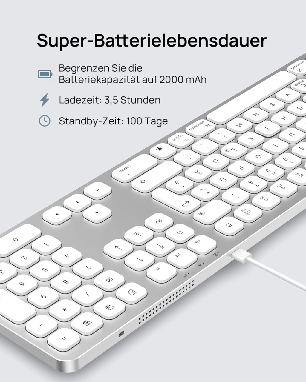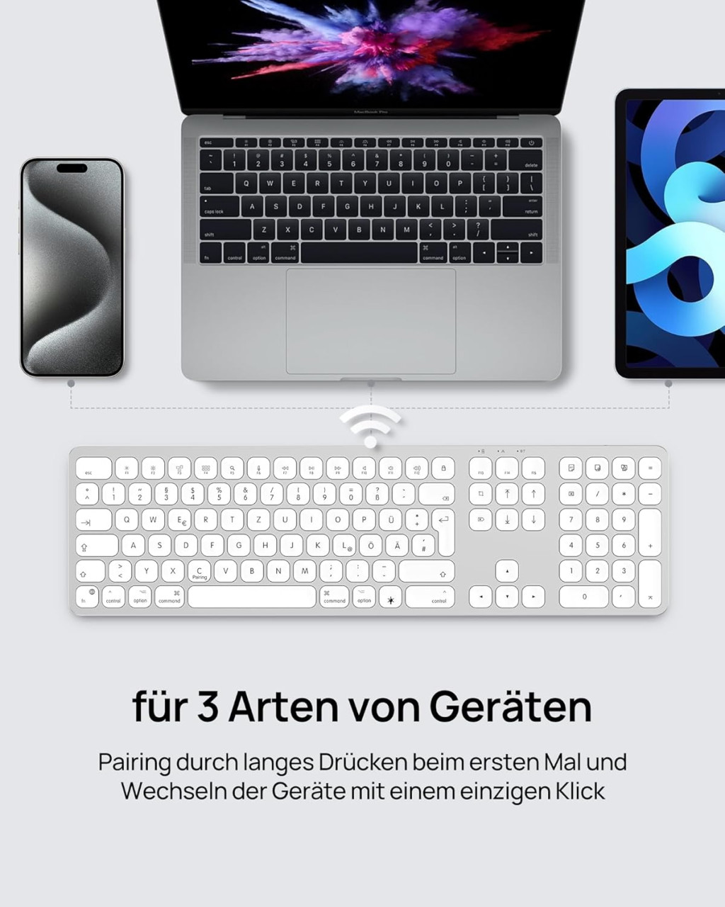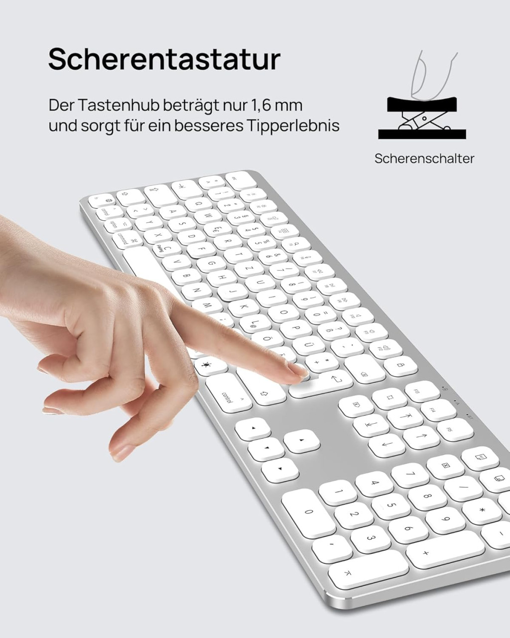 A SODI Wireless Bluetooth Keyboard egy prémium minőségű, vezeték nélküli billentyűzet, amely kifejezetten Mac, iPad és iPhone eszközökhöz lett tervezve. Az elegáns alumínium ház, a 110 gombos teljes méretű kiosztás és a korszerű Bluetooth 5.0 technológia kombinációja egy olyan billentyűzetet eredményez, amely tökéletesen illeszkedik az Apple ökoszisztémájába. A QWERTZ német billentyűzet-elrendezés biztosítja a német nyelvű felhasználók számára az optimális gépelési élményt.