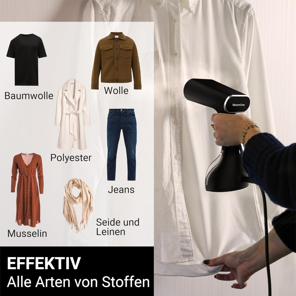 }));Warum einen Dampfglätter statt einer Dampfbügelstation oder eines Bügeleisens verwenden?Der Dampfglätter ist die schnelle, effiziente Lösung für müheloses Glätten. Alle Textilien ohne Risiko von Verbrennungen oder Glanzstellen. Dampf reduziert bis zu 70 % unerwünschte Gerüche.Wie verwendet man einen Steamer?1) Ich hänge mein Kleidungsstück an einen stabilen Kleiderbügel. 2) Ich spanne den Stoff. 3) Ich setze die Platte direkt auf den Stoff. 4) Ich löse den Dampf aus. Ich achte darauf, meine Hand mit einem Schutzhandschuh zu schützen.Sind die SteamOne Steamer für alle Textilarten geeignet?Ja, denn der Kopf eines SteamOne Dampfglätters erhitzt sich nicht über 120°C. Die Produkte können auf allen Textilien verwendet werden. Wir raten von der Anwendung auf Leder und pflanzlichem Leder ab.Beeinträchtigt der Dampf der Steamer die Kleidung?Der Dampf beschädigt die Stoffe nicht. Sie können sogar Stoffe mit Pailletten, Sequins, Stickereien oder Beflockung glätten, die mit Bügeleisen und Dampfbügelstation schwer zu behandeln sind.Sind die SteamOne Steamer nur für Profis bestimmt?Jeder kann von den Vorteilen eines Steamers profitieren. Keine komplizierte Technik mehr, kein Bügelbrett, keine langen Aufheizzeiten und kein mühsames Befüllen des Tanks. Mit SteamOne wird alles einfacher.(function(f) {var _np=(window.P._namespace("PremiumAplusModule"));if(_np.guardFatal){_np.guardFatal(f)(_np);}else{f(_np);}}(function(P) {