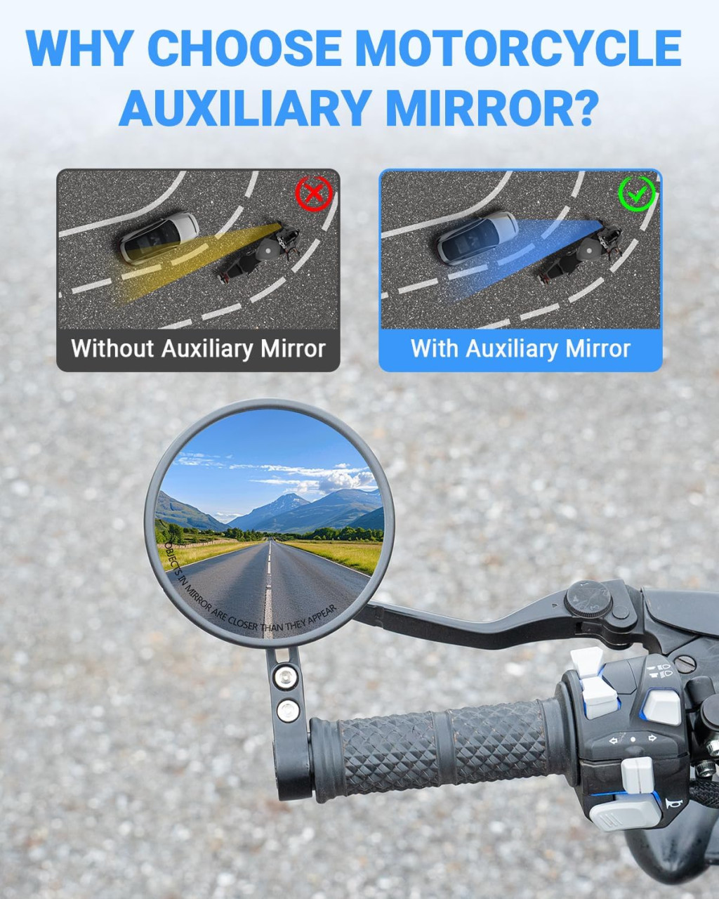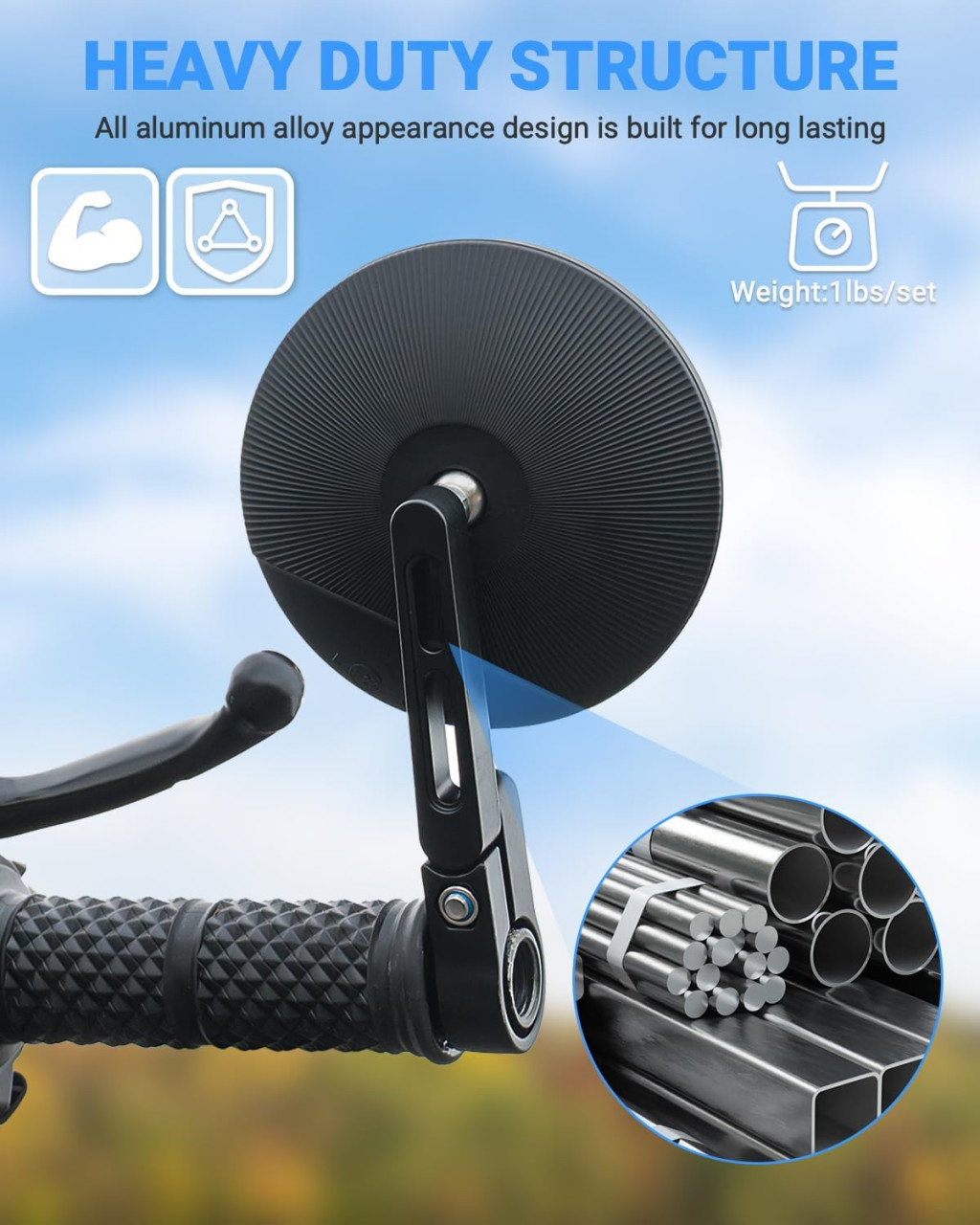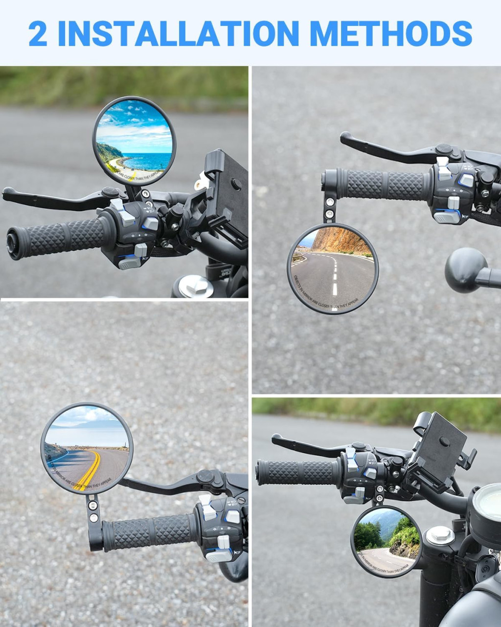A termék 22 mm és 25,4 mm átmérőjű kormányzárhoz is kompatibilis, így szinte minden motorkerékpár típushoz alkalmazható. A csomag két tükröt tartalmaz, és a telepítés rendkívül egyszerű, középen vagy a kormányzár végén is rögzíthető anélkül, hogy módosítani kellene a belső vagy végső kiegészítőket.