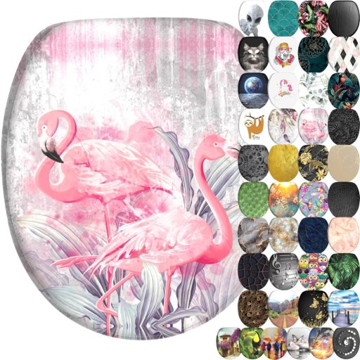Sanilo Flamingo 2 WC Ülőke Lassú Záródással - Fa Anyagú, Könnyen Szerelhető, Strapabíró Zsanérokkal, Flamingó Mintás Toalett Fedél