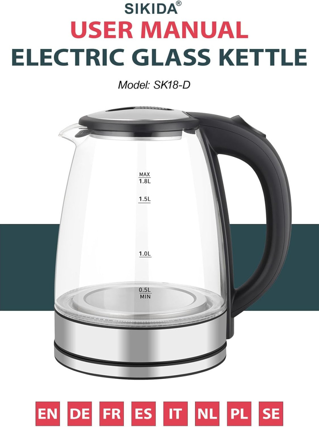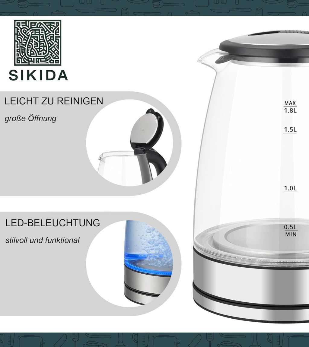 A Sikida üveg vízforraló 1,8 literes kapacitással és prémium funkciókat kínál: