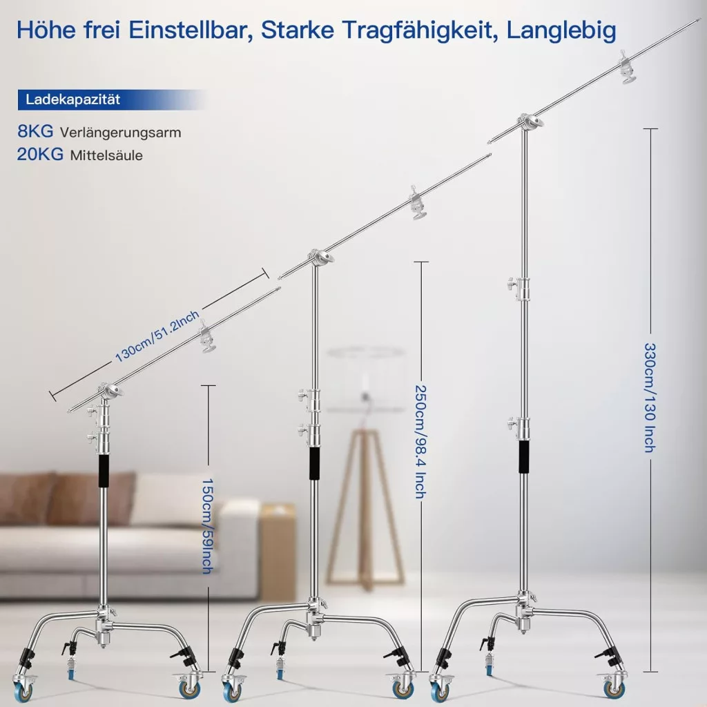 • 130 cm-es kiterjeszthető kar: Professzionális boom arm a fények és kamerák felülről történő pozicionálásához