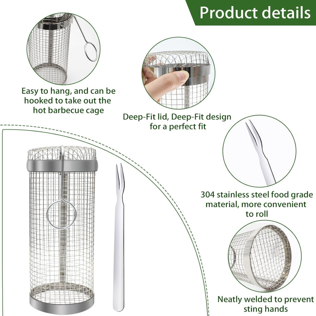 • Forgó kialakítás: Egyszerűen helyezze az ételt a kosárba, zárja le a fedelet, és tegye a grillre - a forgatással egyenletesen sül minden oldal
