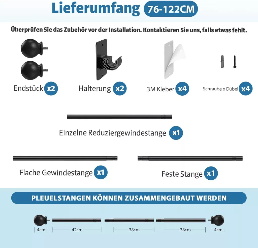 A TRAROD függönyrúd szett minden szükséges alkatrészt tartalmaz a gyors és könnyű telepítéshez: