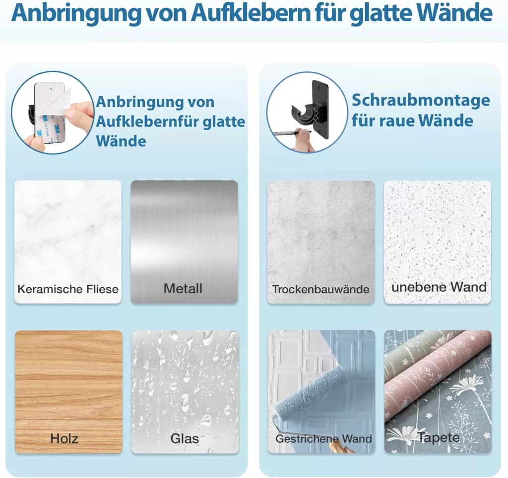 - Ragasztó alapú rögzítés - nem minden falfelületre alkalmas (pl. nagyon érdes vagy porózus falak)
