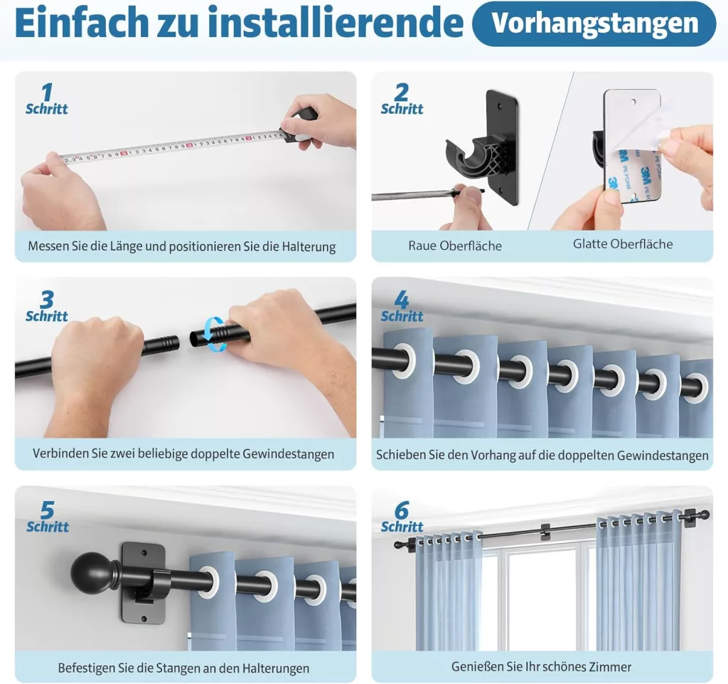 A függönyrúd telepítése rendkívül egyszerű és mindössze 10 percet vesz igénybe. Először tisztítsa meg és szárítsa meg a falfelületet, ahol a konzolokat szeretné rögzíteni. Ezután távolítsa el a 3M ragasztó szalag védőfóliáját, és nyomja rá a konzolokat a falra. Hagyja száradni a ragasztót 24 órán keresztül, mielőtt a függönyöket felakasztaná. Az extenzibilis rúd hosszát a szükséges mérethez állítsa, majd helyezze be a konzolokba. Végül akassza fel a függönyöket a rúdra, és élvezze az új, elegáns megjelenést.