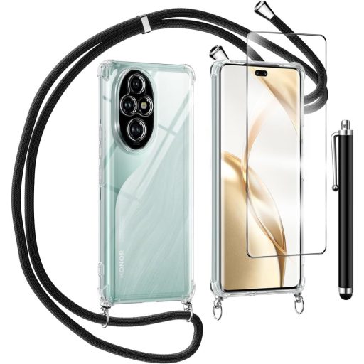 TTSWJBD Honor 200 Pro 5G Átlátszó Telefontok Nyakpánttal - Levehető Fekete Zsinórral, Képernyővédővel, Ütésálló Szilikontok Szabadtéri Haszn
