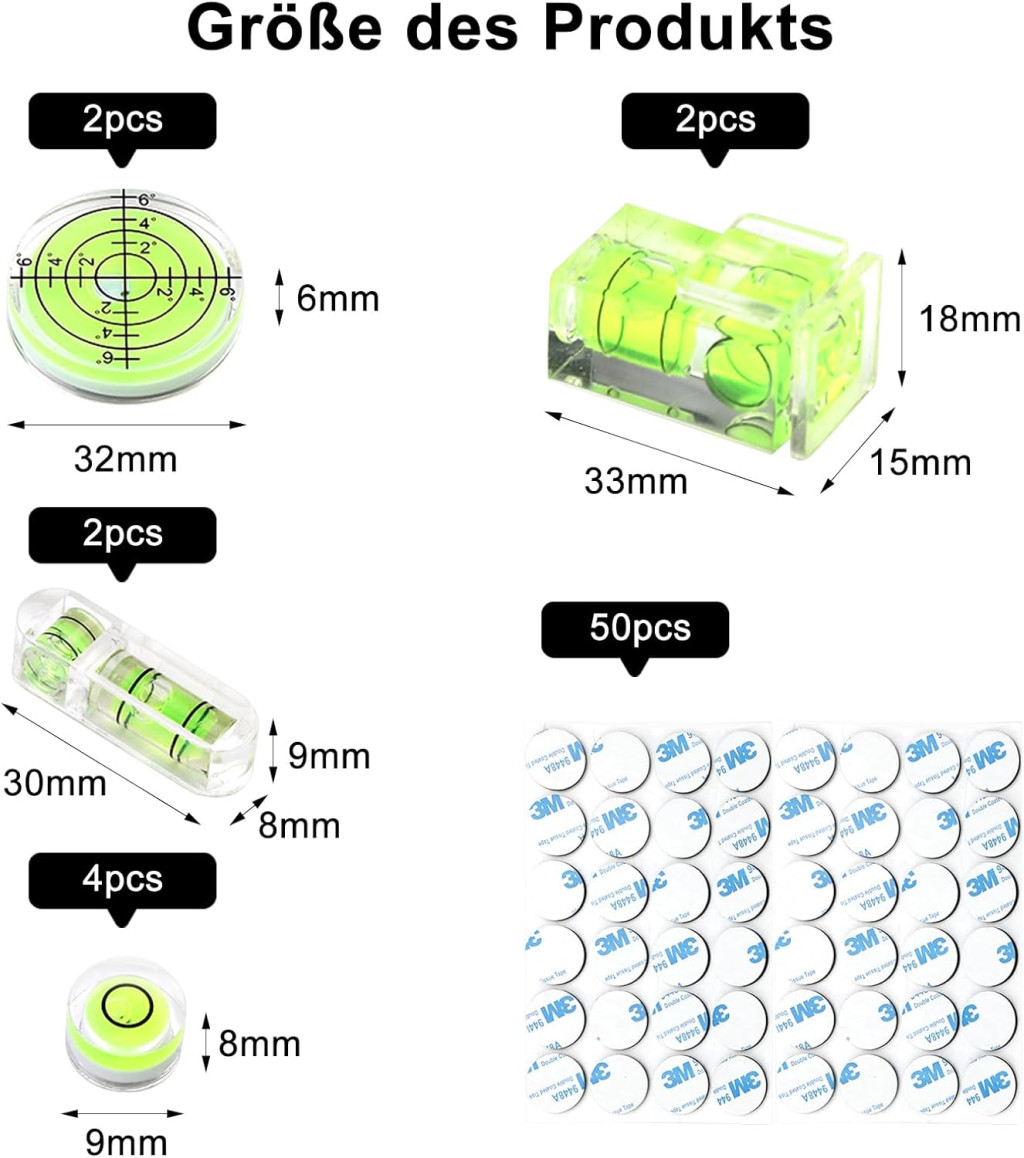 Előnyök: Ez a szintezőkészlet számos előnnyel rendelkezik a hasonló termékekhez képest. Az ABS anyag kiváló minőségű és hosszú élettartamú. A 10 darabos csomag elegendő a legtöbb felhasználónak, míg a 50 darab ragasztó biztosítja a hosszú ideig tartó használatot. Az alacsony ár-érték arány kiváló értéket nyújt. A könnyű súly és kompakt méret ideális utazáshoz. A világos buborék-jelzés könnyen leolvasható.
