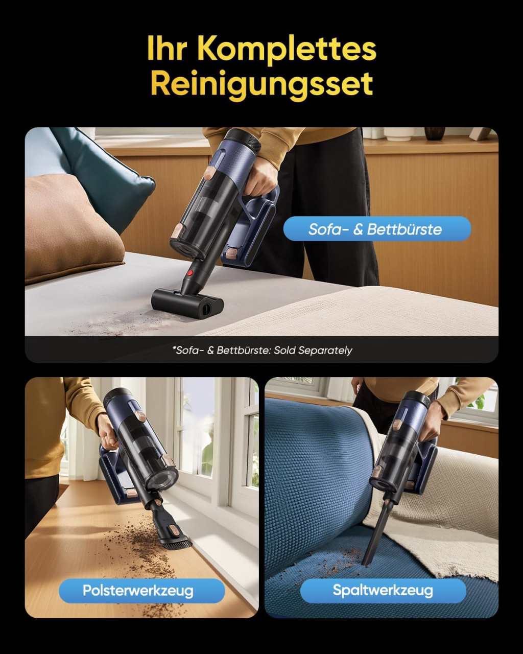 A készülék különféle fej-kiegészítőkkel kompatibilis, amelyek lehetővé teszik a bútorok, autók és egyéb felületek speciális takarítását. A HEPA szűrő cserélhető, biztosítva a hosszú élettartamot és a folyamatos teljesítményt.