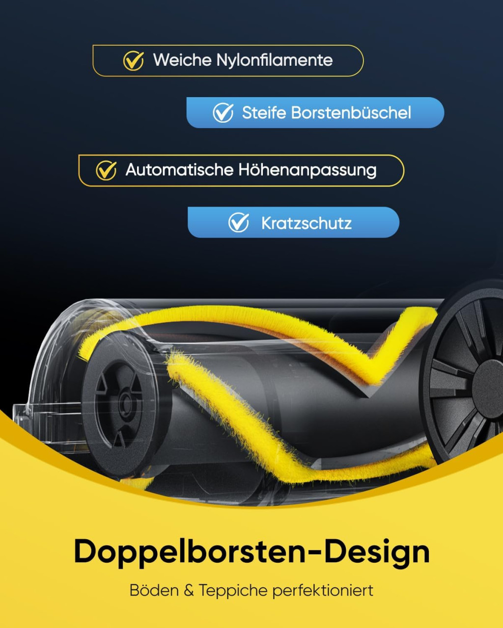 Ez a 6 az 1-ben porszívó kombinálható egy opcionális 330 ml-es vízzel töltött tartállyal, amely lehetővé teszi az egyidejű szívást és nedves tisztítást. Az LED érintőképernyő valós időben mutatja az akkumulátor szintjét, szívási módokat és eltömődési figyelmeztetéseket, biztosítva a zavartalan takarítást.