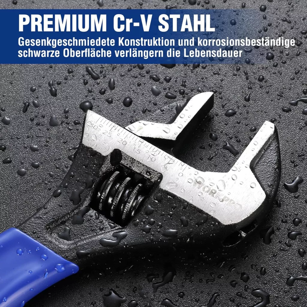 Az ergonomikus kétanyagú fogantyú biztosítja a kényelmes és biztonságos fogást, csökkentve a fáradtságot hosszabb munkasessziók során. A metrikus mérési skála (0-30 mm) az elülső és hátsó oldalon segít a pontos méretmeghatározásban. Ez a csavarkulcs ideális választás szerelőknek, vízvezeték-szerelőknek és DIY-rajongóknak egyaránt.