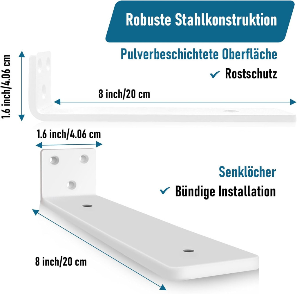 A szerelés egyszerű és gyors - csak fúrja meg a falat a megjelölt helyeken, helyezze be a falitöltőket, és csavarozza fel a konzolokat. A termék 20 cm hosszúságú, így ideális a legtöbb polc mérethez.
