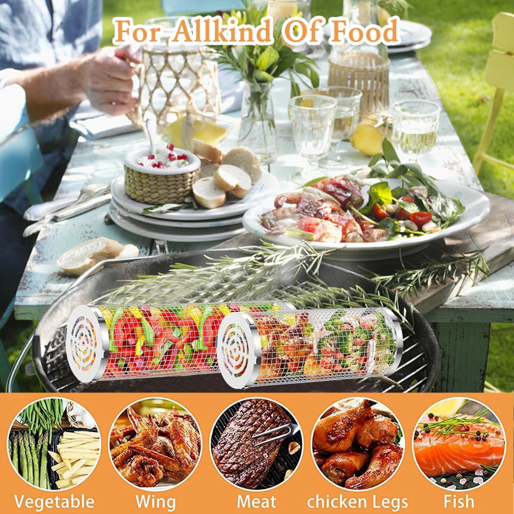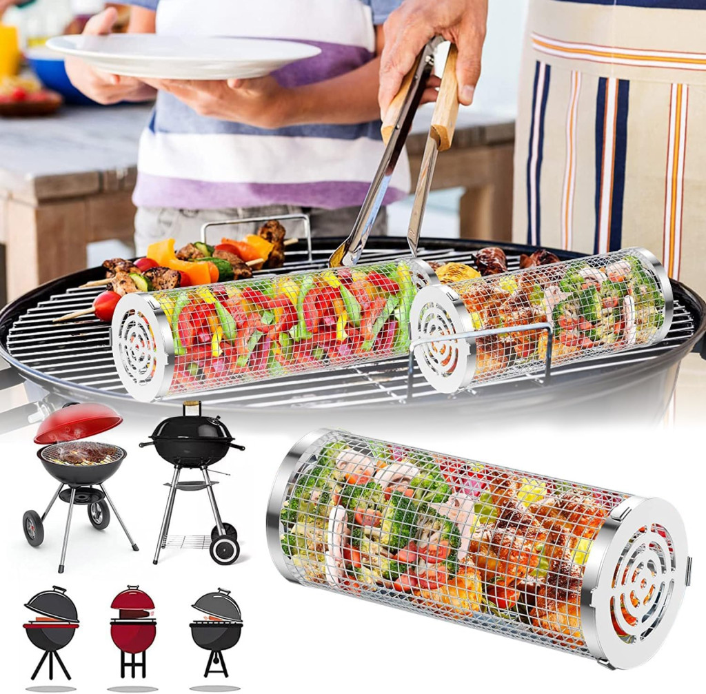 YumSur 2 db Rozsdamentes Acél Grillkosár Szett - Forgatható BBQ Kosár Zöldségekhez, Kempingezéshez, Sütőhöz - Mosogatógépben Mosható