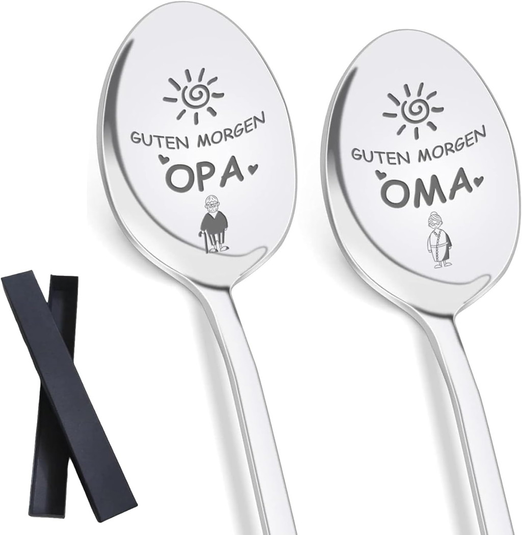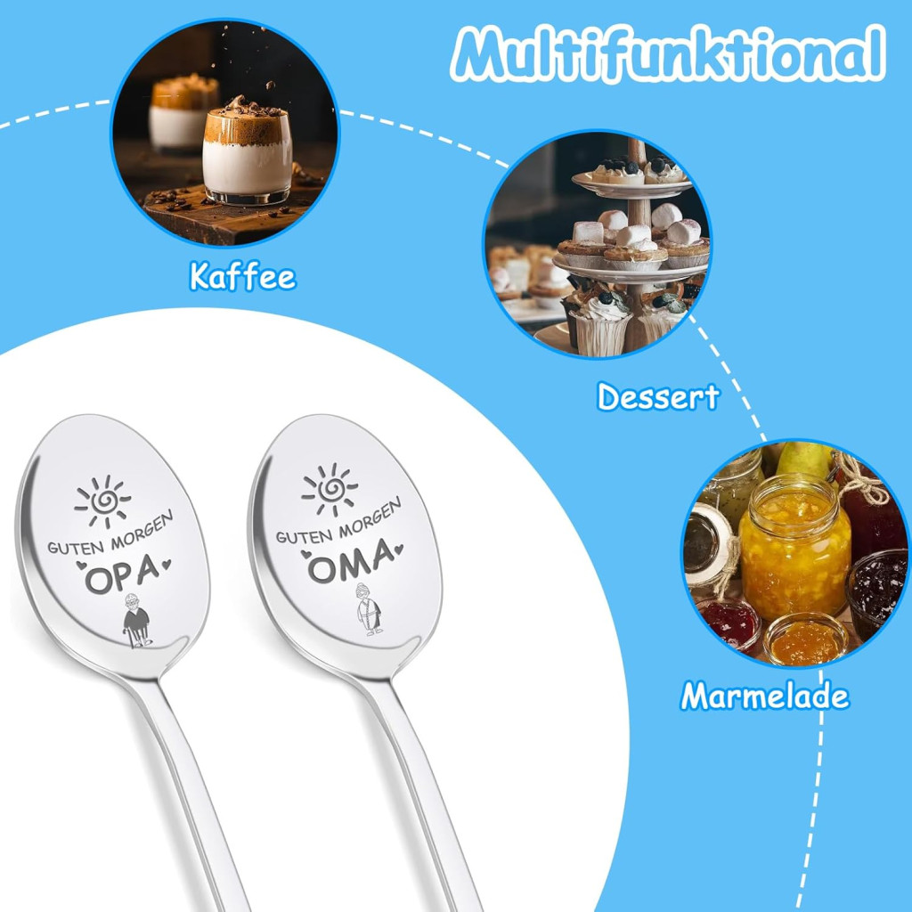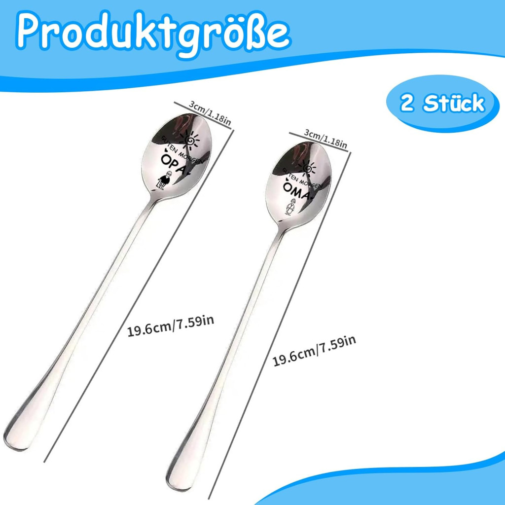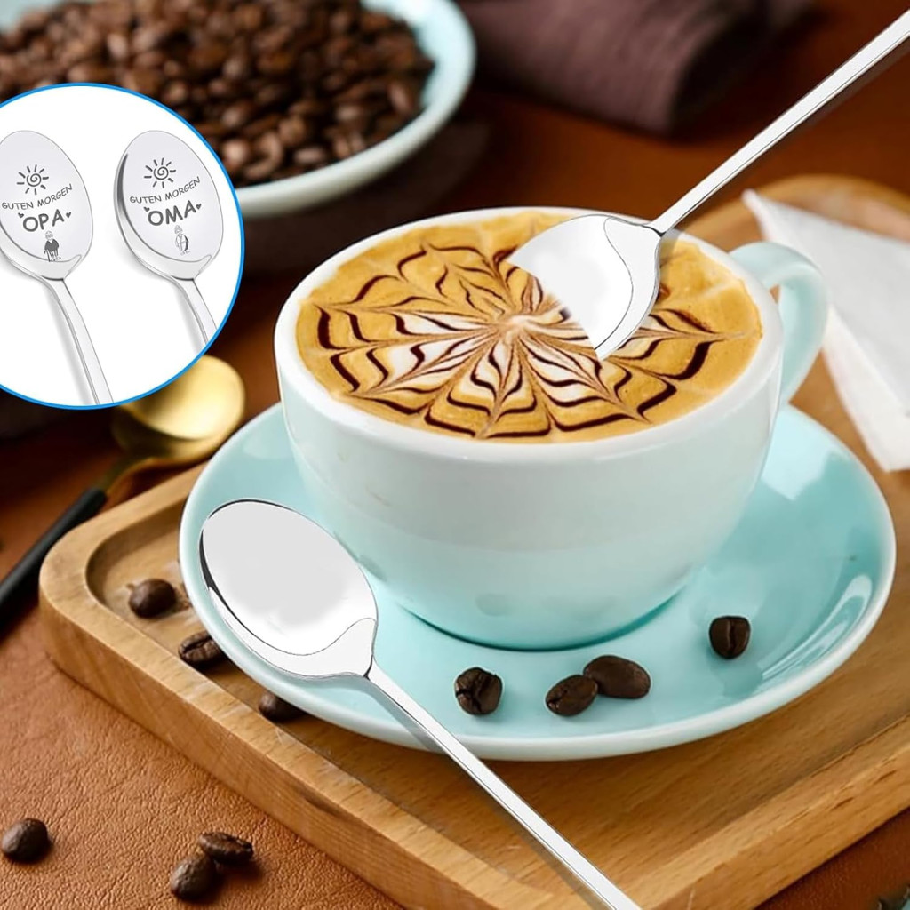 Ez a különleges kávéskanál szett sokkal több, mint egy egyszerű evőeszköz – egy érzelmes ajándék, amely minden nap emlékeztetni fogja nagyszüleit az Ön szeretetére. A gravírozott felirat "Guten Morgen, Oma und Opa" (Jó reggelt, Nagymama és Nagypapa) minden szóban az Ön gondoskodása és szeretete tükröződik. Amikor nagyszülei reggel a konyhában megveszik ezt a kanálat, biztosan mosolyogni fognak, és gondolni fognak Önre.