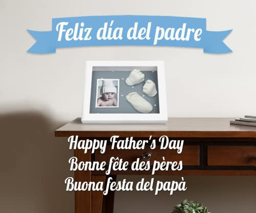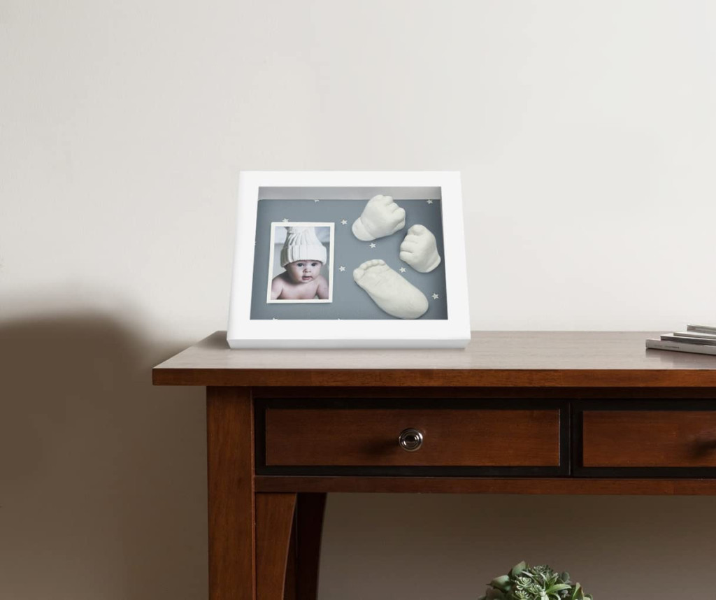 A 25 x 20 x 5 cm méretű fehér képkeret elegáns megjelenést biztosít, és lehetőséget ad arra, hogy a baba fényképét is elhelyezze a kéz- vagy lábnyomat mellett. A keret hátulján található akasztó és támasztóláb révén falra és bútorra egyaránt elhelyezhető.