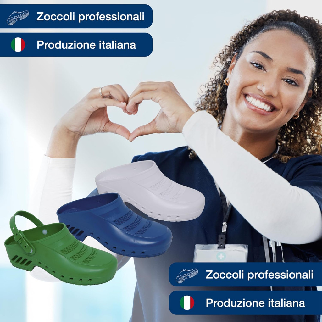 A papucs SEBS anyagból készült, amely rendkívül tartós, könnyű és higiénikus. Az anyag könnyen tisztítható és fertőtlenítható, ami elengedhetetlen az egészségügyi környezetben. A felső részén található lyukak biztosítják a megfelelő szellőzést, így a lábak nem izzadnak meg még hosszú műszakok alatt sem.