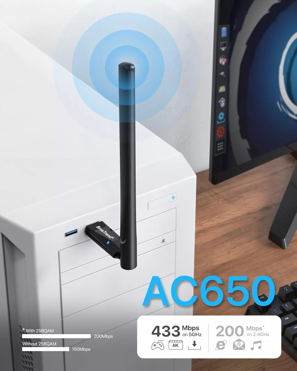 A BrosTrend AC5L 650Mbps adapter a piacon az egyik legjobb ár-érték arányú Linux WiFi megoldás. Az 5GHz sávon 433Mbps sebességet nyújt, amely ideális HD videó streaminghez, online játékokhoz és nagy fájlok letöltéséhez. A 2.4GHz sáv 200Mbps sebessége (256QAM modulation támogatás mellett) megfelelő videohívásokhoz és webböngészéshez.