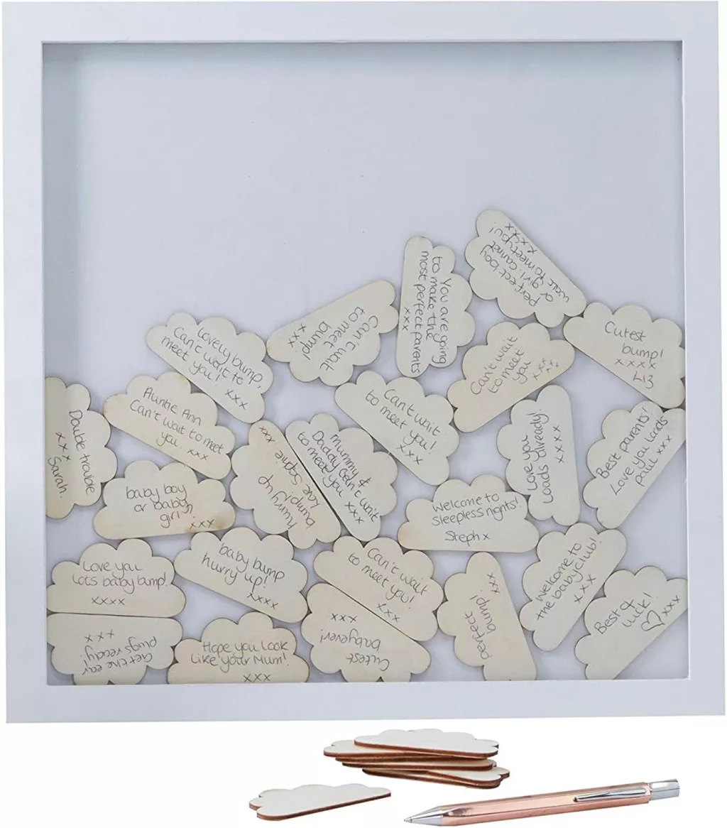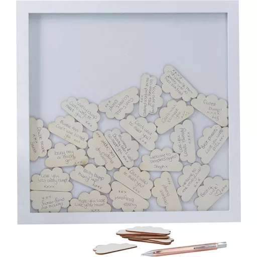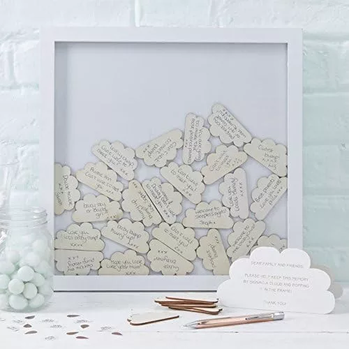 Ez a gyönyörű felhő alakú vendégkönyv az ideális emléktárgy minden babazuhanyhoz. A termék lehetővé teszi, hogy a meghívott vendégek személyes üzeneteket írjanak a felhőkre, amelyek majd a keretbe kerülnek. Ez egy olyan szép emlék lesz, amelyre évek múlva is szívesen visszanéznek. A 30 darab üres felhő papír teljesen testreszabható, így minden vendég saját szavait írhatja fel. Az egyszerű fehér négyzet alakú keret bármilyen babazuhany témához tökéletesen illik, és elegáns megjelenést kölcsönöz az eseménynek.