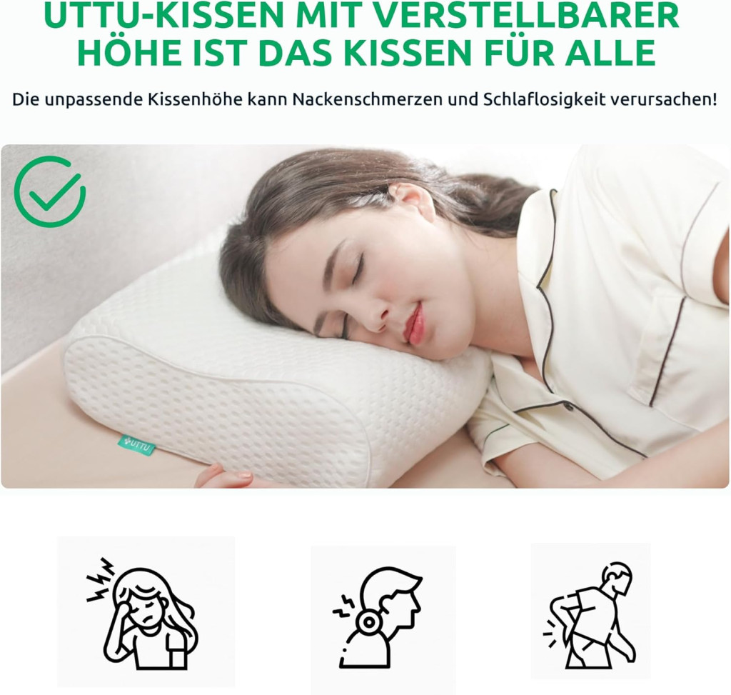 Az UTTU Memory Foam Pillow felnőtteknek tervezett és minden alvási pozícióhoz alkalmas. A párna mérete (60 x 36 cm) standard ágyakhoz és különféle matracokhoz illeszkedik. Az állítható magasság lehetővé teszi, hogy személyre szabd az élményt az egyéni igények szerint.